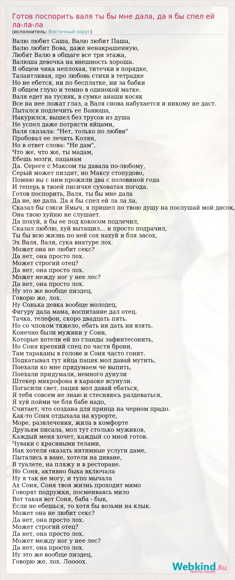 Готов поспорить валя ты бы мне дала, да я бы спел ей ла-ла-ла