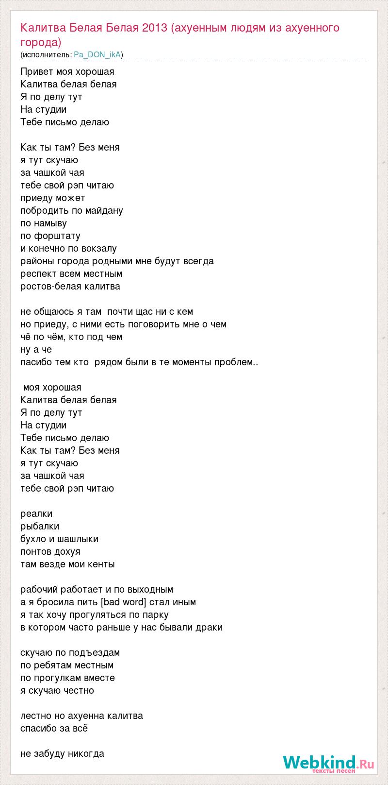 Привет моя хорошая Калитва белая белая Я по делу тут На студии Тебе письмо делаю Как ты там? Без меня я тут скучаю за чашкой чая тебе свой рэп читаю приеду может побродить по майдану по намыву по форштату и конечно по вокзалу районы города родными мне будут всегда респект всем местным ростов-белая калитва не общаюсь я там почти щас ни с кем но приеду, с ними есть поговорить мне о чем чё по чём, кто под чем ну а че пасибо тем кто рядом были в те моменты проблем.. моя хорошая Калитва белая белая Я по делу тут На студии Тебе письмо делаю Как ты там? Без меня я тут скучаю за чашкой чая тебе свой рэп читаю реалки рыбалки бухло и шашлыки понтов дохуя там везде мои кенты рабочий работает и по выходным а я бросила пить [bad word] стал иным я так хочу прогуляться по парку в котором часто раньше у нас бывали драки скучаю по подъездам по ребятам местным по прогулкам вместе я скучаю честно лестно но ахуенна калитва спасибо за всё не забуду никогда