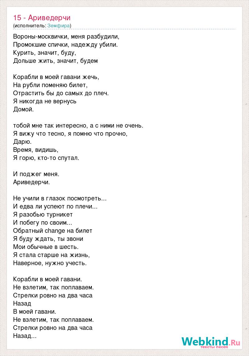 Вороны-москвички, меня разбудили, Промокшие спички, надежду убили. Курить, значит, буду, Дольше жить, значит, будем Корабли в моей гавани жечь, На рубли поменяю билет, Отрастить бы до самых до плеч. Я никогда не вернусь Домой. тобой мне так интересно, а с ними не очень. Я вижу что тесно, я помню что прочно, Дарю. Время, видишь, Я горю, кто-то спутал. И поджег меня. Ариведерчи. Не учили в глазок посмотреть... И едва ли успеют по плечи... Я разобью турникет И побегу по своим... Обратный change на билет Я буду ждать, ты звони Мои обычные в шесть. Я стала старше на жизнь, Наверное, нужно учесть. Корабли в моей гавани. Не взлетим, так поплаваем. Стрелки ровно на два часа Назад В моей гавани. Не взлетим, так поплаваем. Стрелки ровно на два часа Назад...