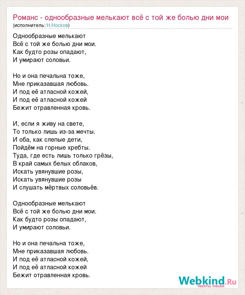 Однообразные мелькают Всё с той же болью дни мои. Как будто розы опадают, И умирают соловьи. Но и она печальна тоже, Мне приказавшая любовь. И под её атласной кожей, И под её атласной кожей Бежит отравленная кровь. И, если я живу на свете, То только лишь из-за мечты. И оба, как слепые дети, Пойдём на горные хребты. Туда, где есть лишь только грёзы, В край самых белых облаков, Искать увянувшие розы, Искать увянувшие розы И слушать мёртвых соловьёв. Однообразные мелькают Всё с той же болью дни мои. Как будто розы опадают, И умирают соловьи. Но и она печальна тоже, Мне приказавшая любовь. И под её атласной кожей, И под её атласной кожей Бежит отравленная кровь.