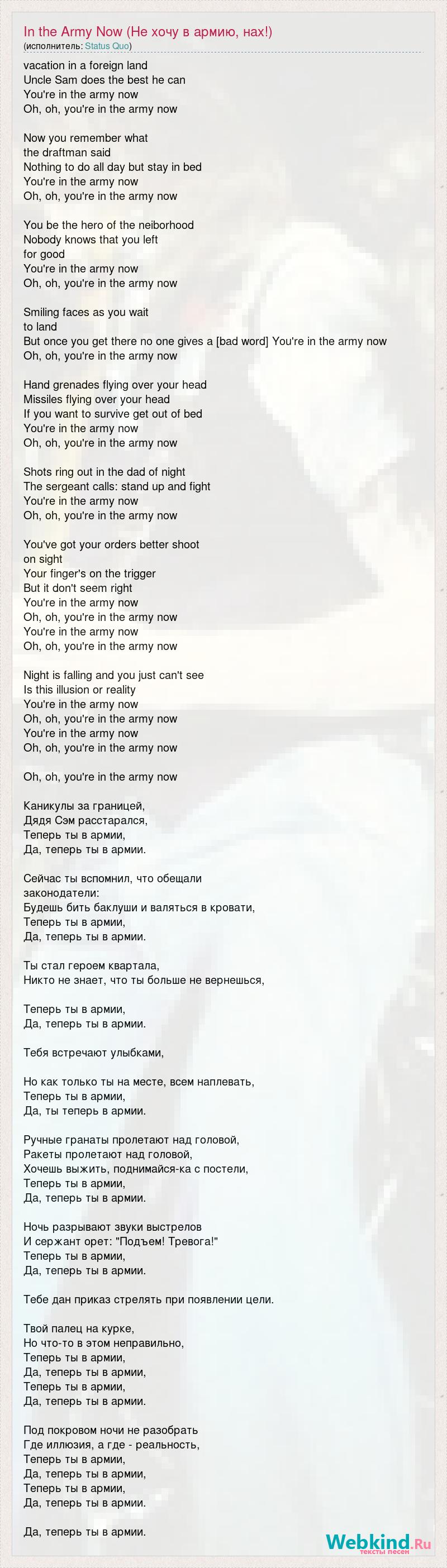 vacation in a foreign land Uncle Sam does the best he can You're in the army now Oh, oh, you're in the army now Now you remember what the draftman said Nothing to do all day but stay in bed You're in the army now Oh, oh, you're in the army now You be the hero of the neiborhood Nobody knows that you left for good You're in the army now Oh, oh, you're in the army now Smiling faces as you wait to land But once you get there no one gives a [bad word] You're in the army now Oh, oh, you're in the army now Hand grenades flying over your head Missiles flying over your head If you want to survive get out of bed You're in the army now Oh, oh, you're in the army now Shots ring out in the dad of night The sergeant calls: stand up and fight You're in the army now Oh, oh, you're in the army now You've got your orders better shoot on sight Your finger's on the trigger But it don't seem right You're in the army now Oh, oh, you're in the army now You're in the army now Oh, oh, you're in the army now Night is falling and you just can't see Is this illusion or reality You're in the army now Oh, oh, you're in the army now You're in the army now Oh, oh, you're in the army now Oh, oh, you're in the army now Каникулы за границей, Дядя Сэм расстарался, Теперь ты в армии, Да, теперь ты в армии. Сейчас ты вспомнил, что обещали законодатели: Будешь бить баклуши и валяться в кровати, Теперь ты в армии, Да, теперь ты в армии. Ты стал героем квартала, Никто не знает, что ты больше не вернешься, Теперь ты в армии, Да, теперь ты в армии. Тебя встречают улыбками, Но как только ты на месте, всем наплевать, Теперь ты в армии, Да, ты теперь в армии. Ручные гранаты пролетают над головой, Ракеты пролетают над головой, Хочешь выжить, поднимайся-ка с постели, Теперь ты в армии, Да, теперь ты в армии. Ночь разрывают звуки выстрелов И сержант орет: "Подъем! Тревога!" Теперь ты в армии, Да, теперь ты в армии. Тебе дан приказ стрелять при появлении цели. Твой палец на курке, Но что-то в этом неправильно, Теперь ты в армии, Да, теперь ты в армии, Теперь ты в армии, Да, теперь ты в армии. Под покровом ночи не разобрать Где иллюзия, а где - реальность, Теперь ты в армии, Да, теперь ты в армии, Теперь ты в армии, Да, теперь ты в армии. Да, теперь ты в армии.