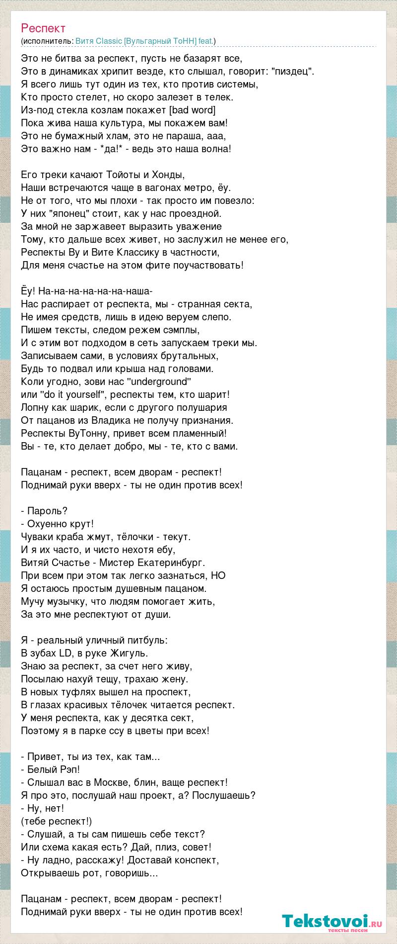 Это не битва за респект, пусть не базарят все, Это в динамиках хрипит везде, кто слышал, говорит: "пиздец". Я всего лишь тут один из тех, кто против системы, Кто просто стелет, но скоро залезет в телек. Из-под стекла козлам покажет [bad word] Пока жива наша культура, мы покажем вам! Это не бумажный хлам, это не параша, ааа, Это важно нам - *да!* - ведь это наша волна! Его треки качают Тойоты и Хонды, Наши встречаются чаще в вагонах метро, ёу. Не от того, что мы плохи - так просто им повезло: У них "японец" стоит, как у нас проездной. За мной не заржавеет выразить уважение Тому, кто дальше всех живет, но заслужил не менее его, Респекты Ву и Вите Классику в частности, Для меня счастье на этом фите поучаствовать! Ёу! На-на-на-на-на-на-наша- Нас распирает от респекта, мы - странная секта, Не имея средств, лишь в идею веруем слепо. Пишем тексты, следом режем сэмплы, И с этим вот подходом в сеть запускаем треки мы. Записываем сами, в условиях брутальных, Будь то подвал или крыша над головами. Коли угодно, зови нас ''underground'' или ''do it yourself", респекты тем, кто шарит! Лопну как шарик, если с другого полушария От пацанов из Владика не получу признания. Респекты ВуТонну, привет всем пламенный! Вы - те, кто делает добро, мы - те, кто с вами. Пацанам - респект, всем дворам - респект! Поднимай руки вверх - ты не один против всех! - Пароль? - Охуенно крут! Чуваки краба жмут, тёлочки - текут. И я их часто, и чисто нехотя ебу, Витяй Счастье - Мистер Екатеринбург. При всем при этом так легко зазнаться, НО Я остаюсь простым душевным пацаном. Мучу музычку, что людям помогает жить, За это мне респектуют от души. Я - реальный уличный питбуль: В зубах LD, в руке Жигуль. Знаю за респект, за счет него живу, Посылаю нахуй тещу, трахаю жену. В новых туфлях вышел на проспект, В глазах красивых тёлочек читается респект. У меня респекта, как у десятка сект, Поэтому я в парке ссу в цветы при всех! - Привет, ты из тех, как там... - Белый Рэп! - Слышал вас в Москве, блин, ваще респект! Я про это, послушай наш проект, а? Послушаешь? - Ну, нет! (тебе респект!) - Слушай, а ты сам пишешь себе текст? Или схема какая есть? Дай, плиз, совет! - Ну ладно, расскажу! Доставай конспект, Открываешь рот, говоришь... Пацанам - респект, всем дворам - респект! Поднимай руки вверх - ты не один против всех!