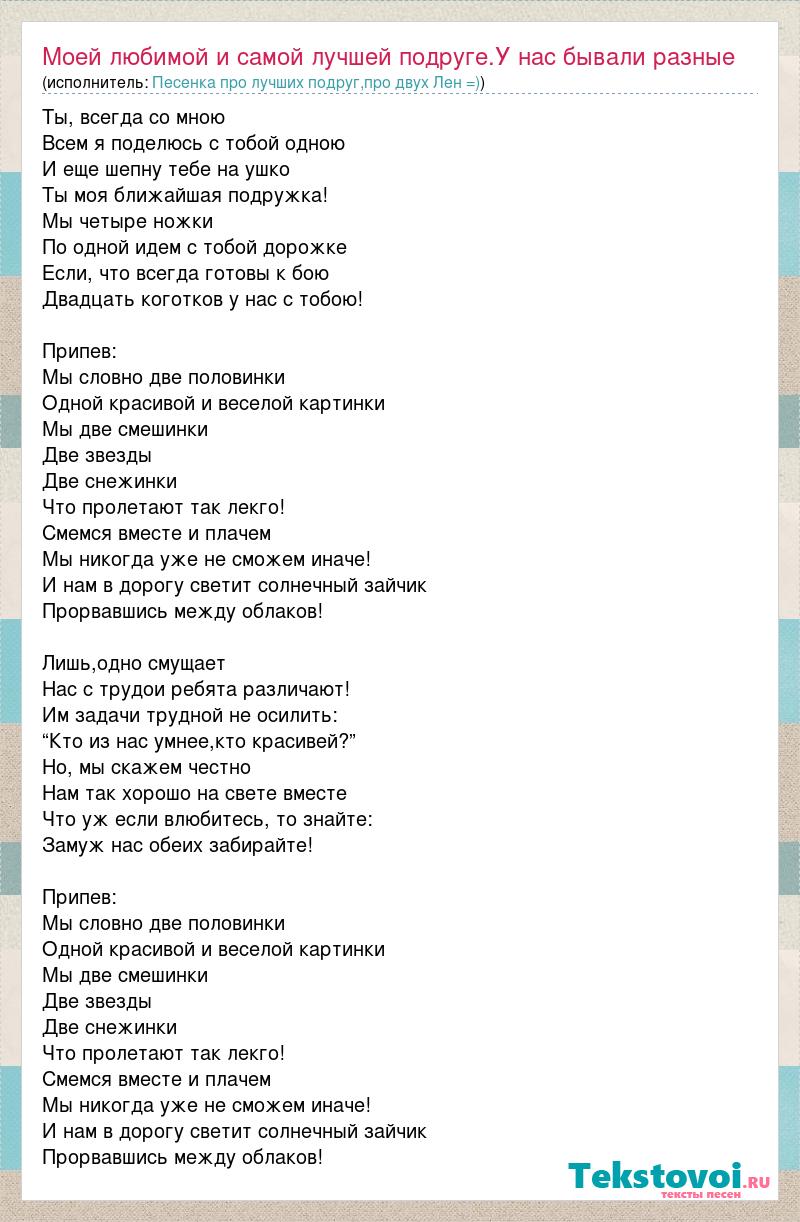 Ты, всегда со мною Всем я поделюсь с тобой одною И еще шепну тебе на ушко Ты моя ближайшая подружка! Мы четыре ножки По одной идем с тобой дорожке Если, что всегда готовы к бою Двадцать коготков у нас с тобою! Припев: Мы словно две половинки Одной красивой и веселой картинки Мы две смешинки Две звезды Две снежинки Что пролетают так лекго! Смемся вместе и плачем Мы никогда уже не сможем иначе! И нам в дорогу светит солнечный зайчик Прорвавшись между облаков! Лишь,одно смущает Нас с трудои ребята различают! Им задачи трудной не осилить: “Кто из нас умнее,кто красивей?” Но, мы скажем честно Нам так хорошо на свете вместе Что уж если влюбитесь, то знайте: Замуж нас обеих забирайте! Припев: Мы словно две половинки Одной красивой и веселой картинки Мы две смешинки Две звезды Две снежинки Что пролетают так лекго! Смемся вместе и плачем Мы никогда уже не сможем иначе! И нам в дорогу светит солнечный зайчик Прорвавшись между облаков!