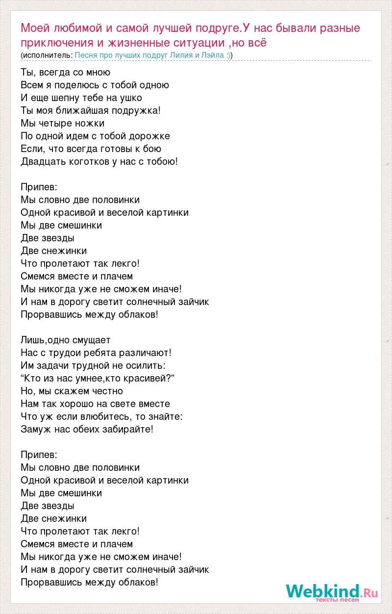 Ты, всегда со мною Всем я поделюсь с тобой одною И еще шепну тебе на ушко Ты моя ближайшая подружка! Мы четыре ножки По одной идем с тобой дорожке Если, что всегда готовы к бою Двадцать коготков у нас с тобою! Припев: Мы словно две половинки Одной красивой и веселой картинки Мы две смешинки Две звезды Две снежинки Что пролетают так лекго! Смемся вместе и плачем Мы никогда уже не сможем иначе! И нам в дорогу светит солнечный зайчик Прорвавшись между облаков! Лишь,одно смущает Нас с трудои ребята различают! Им задачи трудной не осилить: “Кто из нас умнее,кто красивей?” Но, мы скажем честно Нам так хорошо на свете вместе Что уж если влюбитесь, то знайте: Замуж нас обеих забирайте! Припев: Мы словно две половинки Одной красивой и веселой картинки Мы две смешинки Две звезды Две снежинки Что пролетают так лекго! Смемся вместе и плачем Мы никогда уже не сможем иначе! И нам в дорогу светит солнечный зайчик Прорвавшись между облаков!
