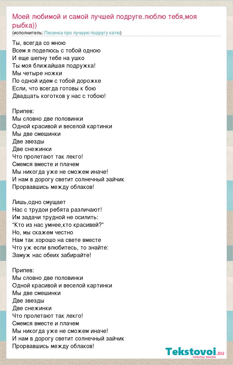 Главная→Исполнители→Песенка про лучшую подругу катю→Моей любимой и самой лучшей подруге.люблю тебя,моя рыбка))