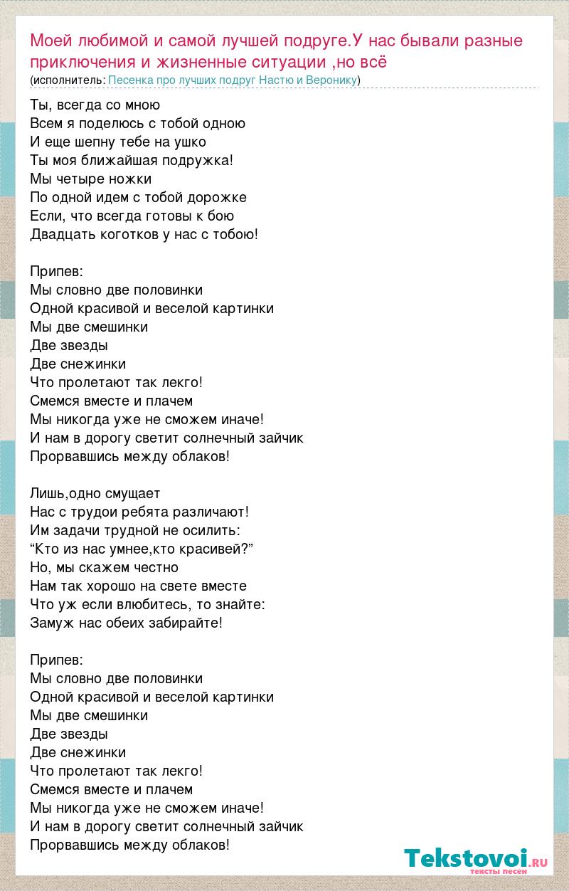Главная→Исполнители→Песенка про лучших подруг Настю и Веронику→Моей любимой и самой лучшей подруге.У нас бывали разные приключения и жизне