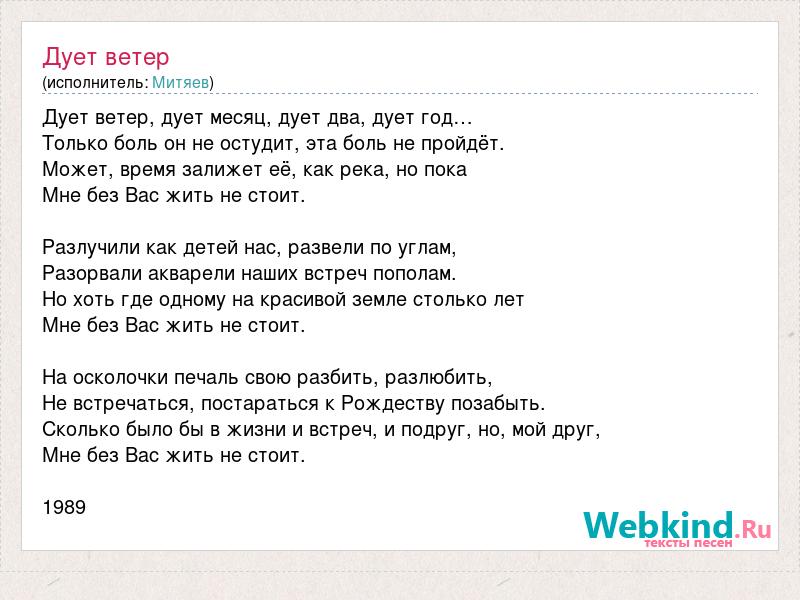 Дует ветер, дует месяц, дует два, дует год… Только боль он не остудит, эта боль не пройдёт. Может, время залижет её, как река, но пока Мне без Вас жить не стоит. Разлучили как детей нас, развели по углам, Разорвали акварели наших встреч пополам. Но хоть где одному на красивой земле столько лет Мне без Вас жить не стоит. На осколочки печаль свою разбить, разлюбить, Не встречаться, постараться к Рождеству позабыть. Сколько было бы в жизни и встреч, и подруг, но, мой друг, Мне без Вас жить не стоит. 1989