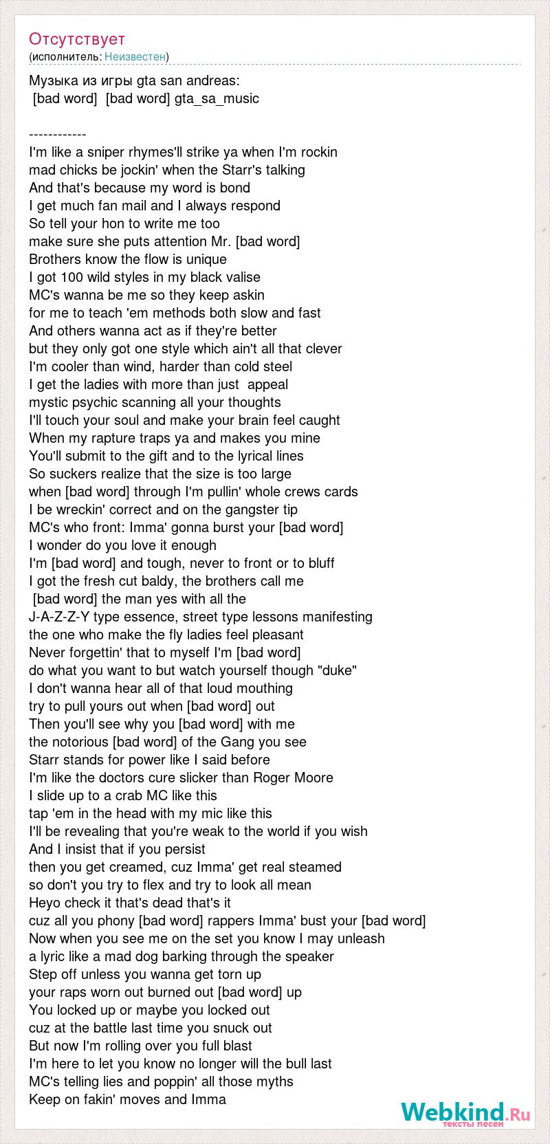 Музыка из игры gta san andreas: [bad word] [bad word] gta_sa_music ------------ I'm like a sniper rhymes'll strike ya when I'm rockin mad chicks be jockin' when the Starr's talking And that's because my word is bond I get much fan mail and I always respond So tell your hon to write me too make sure she puts attention Mr. [bad word] Brothers know the flow is unique I got 100 wild styles in my black valise MC's wanna be me so they keep askin for me to teach 'em methods both slow and fast And others wanna act as if they're better but they only got one style which ain't all that clever I'm cooler than wind, harder than cold steel I get the ladies with more than just appeal mystic psychic scanning all your thoughts I'll touch your soul and make your brain feel caught When my rapture traps ya and makes you mine You'll submit to the gift and to the lyrical lines So suckers realize that the size is too large when [bad word] through I'm pullin' whole crews cards I be wreckin' correct and on the gangster tip MC's who front: Imma' gonna burst your [bad word] I wonder do you love it enough I'm [bad word] and tough, never to front or to bluff I got the fresh cut baldy, the brothers call me [bad word] the man yes with all the J-A-Z-Z-Y type essence, street type lessons manifesting the one who make the fly ladies feel pleasant Never forgettin' that to myself I'm [bad word] do what you want to but watch yourself though "duke" I don't wanna hear all of that loud mouthing try to pull yours out when [bad word] out Then you'll see why you [bad word] with me the notorious [bad word] of the Gang you see Starr stands for power like I said before I'm like the doctors cure slicker than Roger Moore I slide up to a crab MC like this tap 'em in the head with my mic like this I'll be revealing that you're weak to the world if you wish And I insist that if you persist then you get creamed, cuz Imma' get real steamed so don't you try to flex and try to look all mean Heyo check it that's dead that's it cuz all you phony [bad word] rappers Imma' bust your [bad word] Now when you see me on the set you know I may unleash a lyric like a mad dog barking through the speaker Step off unless you wanna get torn up your raps worn out burned out [bad word] up You locked up or maybe you locked out cuz at the battle last time you snuck out But now I'm rolling over you full blast I'm here to let you know no longer will the bull last MC's telling lies and poppin' all those myths Keep on fakin' moves and Imma