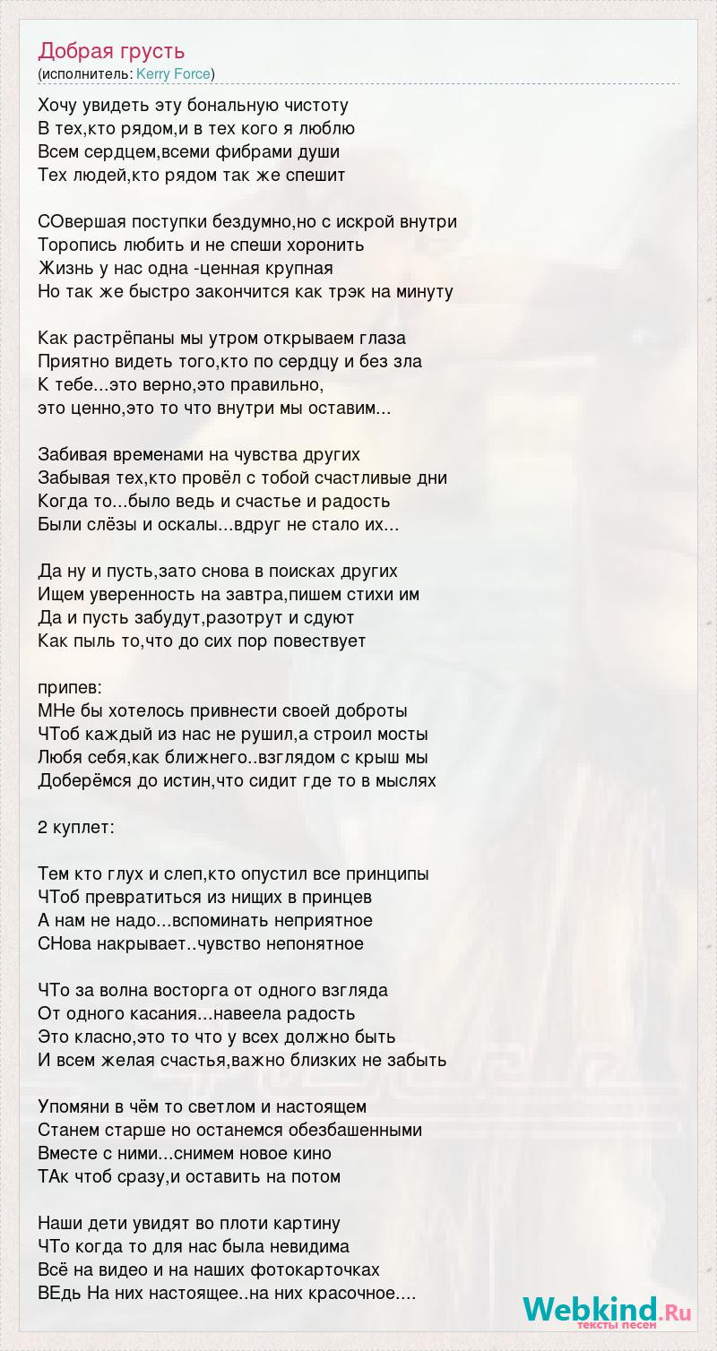 Хочу увидеть эту бональную чистоту В тех,кто рядом,и в тех кого я люблю Всем сердцем,всеми фибрами души Тех людей,кто рядом так же спешит СОвершая поступки бездумно,но с искрой внутри Торопись любить и не спеши хоронить Жизнь у нас одна -ценная крупная Но так же быстро закончится как трэк на минуту Как растрёпаны мы утром открываем глаза Приятно видеть того,кто по сердцу и без зла К тебе...это верно,это правильно, это ценно,это то что внутри мы оставим... Забивая временами на чувства других Забывая тех,кто провёл с тобой счастливые дни Когда то...было ведь и счастье и радость Были слёзы и оскалы...вдруг не стало их... Да ну и пусть,зато снова в поисках других Ищем уверенность на завтра,пишем стихи им Да и пусть забудут,разотрут и сдуют Как пыль то,что до сих пор повествует припев: МНе бы хотелось привнести своей доброты ЧТоб каждый из нас не рушил,а строил мосты Любя себя,как ближнего..взглядом с крыш мы Доберёмся до истин,что сидит где то в мыслях 2 куплет: Тем кто глух и слеп,кто опустил все принципы ЧТоб превратиться из нищих в принцев А нам не надо...вспоминать неприятное СНова накрывает..чувство непонятное ЧТо за волна восторга от одного взгляда От одного касания...навеела радость Это класно,это то что у всех должно быть И всем желая счастья,важно близких не забыть Упомяни в чём то светлом и настоящем Станем старше но останемся обезбашенными Вместе с ними...снимем новое кино ТАк чтоб сразу,и оставить на потом Наши дети увидят во плоти картину ЧТо когда то для нас была невидима Всё на видео и на наших фотокарточках ВЕдь На них настоящее..на них красочное....