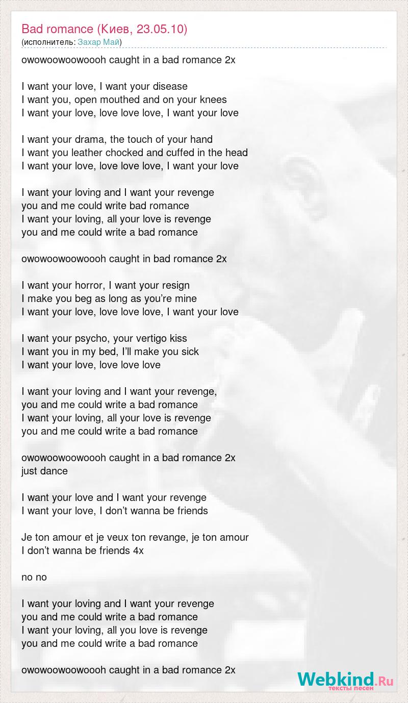 owowoowoowoooh caught in a bad romance 2x I want your love, I want your disease I want you, open mouthed and on your knees I want your love, love love love, I want your love I want your drama, the touch of your hand I want you leather chocked and cuffed in the head I want your love, love love love, I want your love I want your loving and I want your revenge you and me could write bad romance I want your loving, all your love is revenge you and me could write a bad romance owowoowoowoooh caught in bad romance 2x I want your horror, I want your resign I make you beg as long as you’re mine I want your love, love love love, I want your love I want your psycho, your vertigo kiss I want you in my bed, I’ll make you sick I want your love, love love love I want your loving and I want your revenge, you and me could write a bad romance I want your loving, all your love is revenge you and me could write a bad romance owowoowoowoooh caught in a bad romance 2x just dance I want your love and I want your revenge I want your love, I don’t wanna be friends Je ton amour et je veux ton revange, je ton amour I don’t wanna be friends 4x no no I want your loving and I want your revenge you and me could write a bad romance I want your loving, all you love is revenge you and me could write a bad romance owowoowoowoooh caught in a bad romance 2x