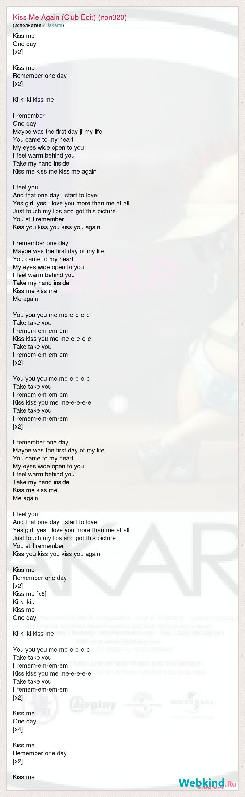 Kiss me One day [x2] Kiss me Remember one day [x2] Ki-ki-ki-kiss me I remember One day Maybe was the first day jf my life You came to my heart My eyes wide open to you I feel warm behind you Take my hand inside Kiss me kiss me kiss me again I feel you And that one day I start to love Yes girl, yes I love you more than me at all Just touch my lips and got this picture You still remember Kiss you kiss you kiss you again I remember one day Maybe was the first day of my life You came to my heart My eyes wide open to you I feel warm behind you Take my hand inside Kiss me kiss me Me again You you you me me-e-e-e-e Take take you I remem-em-em-em Kiss kiss you me me-e-e-e-e Take take you I remem-em-em-em [x2] You you you me me-e-e-e-e Take take you I remem-em-em-em Kiss kiss you me me-e-e-e-e Take take you I remem-em-em-em [x2] I remember one day Maybe was the first day of my life You came to my heart My eyes wide open to you I feel warm behind you Take my hand inside Kiss me kiss me Me again I feel you And that one day I start to love Yes girl, yes I love you more than me at all Just touch my lips and got this picture You still remember Kiss you kiss you kiss you again Kiss me Remember one day [x2] Kiss me [x6] Ki-ki-ki.. Kiss me One day Ki-ki-ki-kiss me You you you me me-e-e-e-e Take take you I remem-em-em-em Kiss kiss you me me-e-e-e-e Take take you I remem-em-em-em [x2] Kiss me One day [x4] Kiss me Remember one day [x2] Kiss me