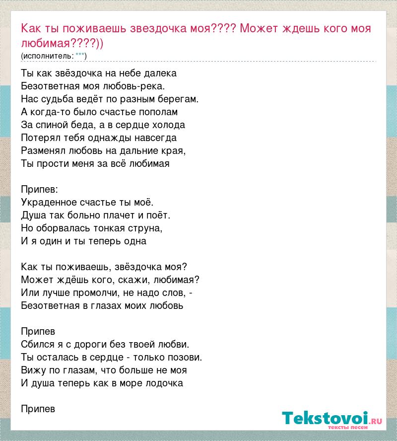 Ты как звёздочка на небе далека Безответная моя любовь-река. Нас судьба ведёт по разным берегам. А когда-то было счастье пополам За спиной беда, а в сердце холода Потерял тебя однажды навсегда Разменял любовь на дальние края, Ты прости меня за всё любимая Припев: Украденное счастье ты моё. Душа так больно плачет и поёт. Но оборвалась тонкая струна, И я один и ты теперь одна Как ты поживаешь, звёздочка моя? Может ждёшь кого, скажи, любимая? Или лучше промолчи, не надо слов, - Безответная в глазах моих любовь Припев Сбился я с дороги без твоей любви. Ты осталась в сердце - только позови. Вижу по глазам, что больше не моя И душа теперь как в море лодочка Припев