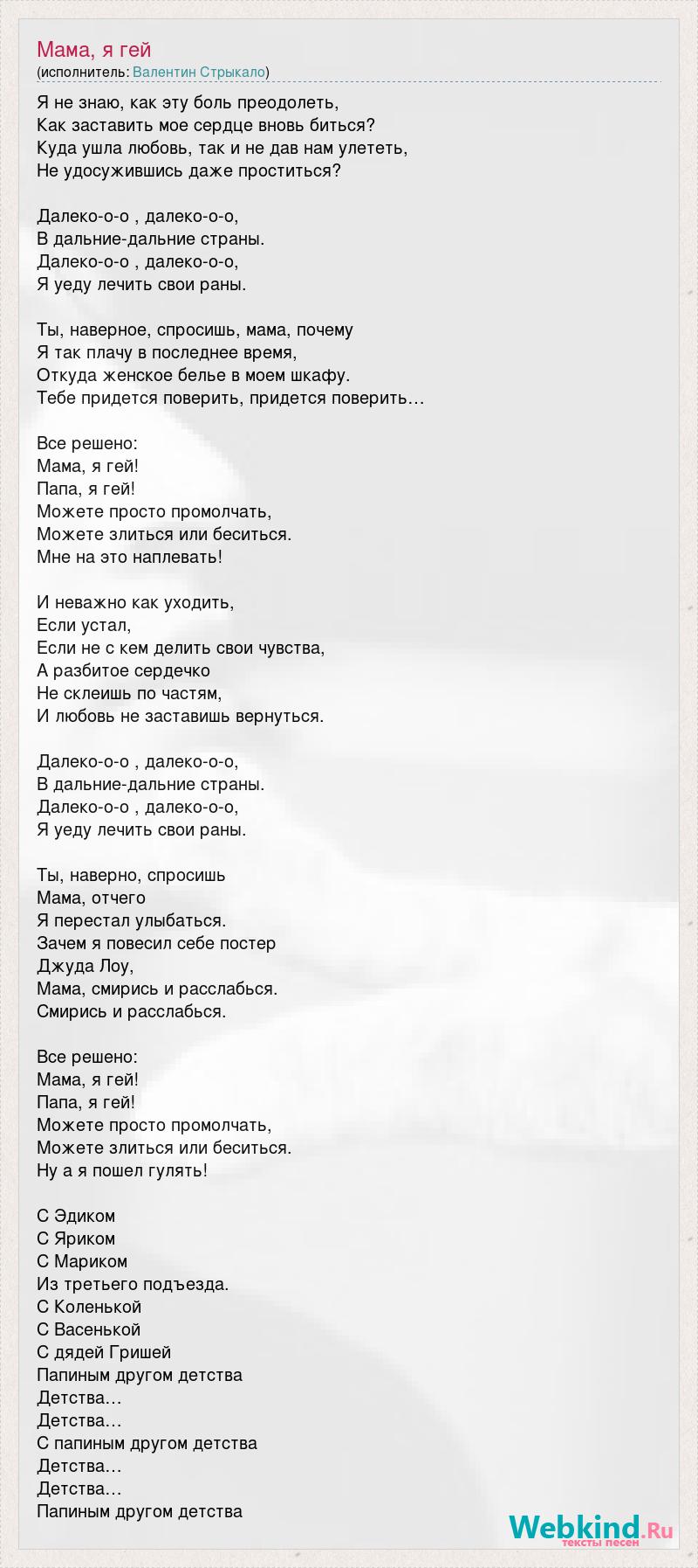 Я не знаю, как эту боль преодолеть, Как заставить мое сердце вновь биться? Куда ушла любовь, так и не дав нам улететь, Не удосужившись даже проститься? Далеко-о-о , далеко-о-о, В дальние-дальние страны. Далеко-о-о , далеко-о-о, Я уеду лечить свои раны. Ты, наверное, спросишь, мама, почему Я так плачу в последнее время, Откуда женское белье в моем шкафу. Тебе придется поверить, придется поверить… Все решено: Мама, я гей! Папа, я гей! Можете просто промолчать, Можете злиться или беситься. Мне на это наплевать! И неважно как уходить, Если устал, Если не с кем делить свои чувства, А разбитое сердечко Не склеишь по частям, И любовь не заставишь вернуться. Далеко-о-о , далеко-о-о, В дальние-дальние страны. Далеко-о-о , далеко-о-о, Я уеду лечить свои раны. Ты, наверно, спросишь Мама, отчего Я перестал улыбаться. Зачем я повесил себе постер Джуда Лоу, Мама, смирись и расслабься. Смирись и расслабься. Все решено: Мама, я гей! Папа, я гей! Можете просто промолчать, Можете злиться или беситься. Ну а я пошел гулять! С Эдиком С Яриком С Мариком Из третьего подъезда. С Коленькой С Васенькой С дядей Гришей Папиным другом детства Детства… Детства… С папиным другом детства Детства… Детства… Папиным другом детства