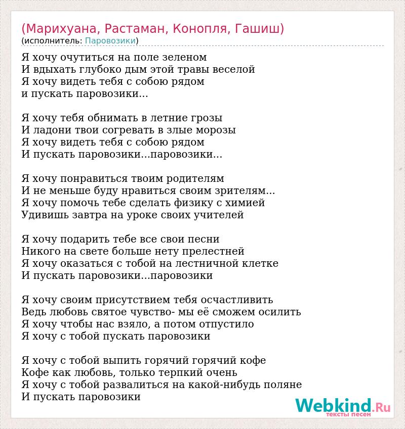 Я хочу очутиться на поле зеленом И вдыхать глубоко дым этой травы веселой Я хочу видеть тебя с собою рядом и пускать паровозики... Я хочу тебя обнимать в летние грозы И ладони твои согревать в злые морозы Я хочу видеть тебя с собою рядом И пускать паровозики...паровозики... Я хочу понравиться твоим родителям И не меньше буду нравиться своим зрителям... Я хочу помочь тебе сделать физику с химией Удивишь завтра на уроке своих учителей Я хочу подарить тебе все свои песни Никого на свете больше нету прелестней Я хочу оказаться с тобой на лестничной клетке И пускать паровозики...паровозики Я хочу своим присутствием тебя осчастливить Ведь любовь святое чувство- мы её сможем осилить Я хочу чтобы нас взяло, а потом отпустило Я хочу с тобой пускать паровозики Я хочу с тобой выпить горячий горячий кофе Кофе как любовь, только терпкий очень Я хочу с тобой развалиться на какой-нибудь поляне И пускать паровозики