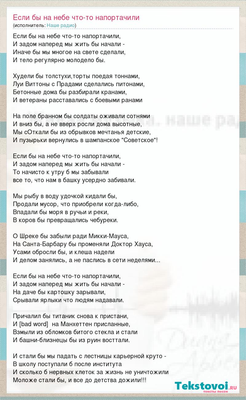 Если бы на небе что-то напортачили, И задом наперед мы жить бы начали - Иначе бы мы многое на свете сделали, И тело регулярно молодело бы. Худели бы толстухи,торты поедая тоннами, Луи Виттоны с Прадами сделались питонами, Бетонные дома бы разбирали кранами, И ветераны расставались с боевыми ранами На поле бранном бы солдаты оживали сотнями И вниз бы, а не вверх росли дома высотные, Мы сОткали бы из обрывков мечтанья детские, И пузырьки вернулись в шампанское "Советское"! Если бы на небе что-то напортачили, И задом наперед мы жить бы начали - То начисто к утру б мы забывали все то, что нам в башку усердно забивали. Мы рыбу в воду удочкой кидали бы, Продали мусор, что приобрели когда-либо, Впадали бы моря в ручьи и реки, В коров бы превращались чебуреки. О Шреке бы забыли ради Микки-Мауса, На Санта-Барбару бы променяли Доктор Хауса, Усами обросли бы, и клеша надели И делом занялись, а не паслись в сети неделями... Если бы на небе что-то напортачили, И задом наперед мы жить бы начали - На даче бы картошку зарывали, Срывали ярлыки что людям надавали. Причалил бы титаник снова к пристани, И [bad word] на Манхеттен присланные, Взмыли из обломков битого стекла и стали И башни-близнецы бы из руин восттали. И стали бы мы падать с лестницы карьерной круто - В школу поступали б после института И сколько б нервных клеток за жизнь не уничтожили Моложе стали бы, и все до детства дожили!!!