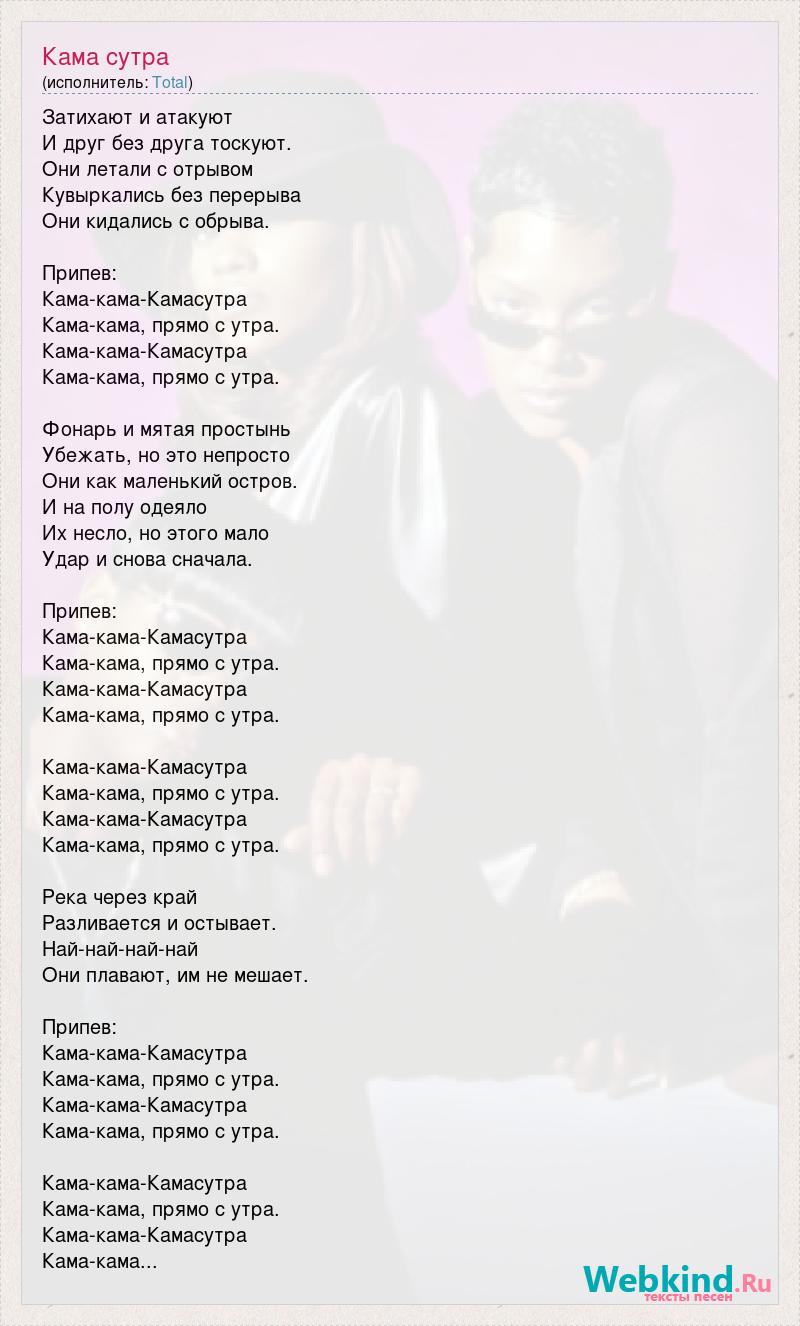 Затихают и атакуют И друг без друга тоскуют. Они летали с отрывом Кувыркались без перерыва Они кидались с обрыва. Припев: Кама-кама-Камасутра Кама-кама, прямо с утра. Кама-кама-Камасутра Кама-кама, прямо с утра. Фонарь и мятая простынь Убежать, но это непросто Они как маленький остров. И на полу одеяло Их несло, но этого мало Удар и снова сначала. Припев: Кама-кама-Камасутра Кама-кама, прямо с утра. Кама-кама-Камасутра Кама-кама, прямо с утра. Кама-кама-Камасутра Кама-кама, прямо с утра. Кама-кама-Камасутра Кама-кама, прямо с утра. Река через край Разливается и остывает. Най-най-най-най Они плавают, им не мешает. Припев: Кама-кама-Камасутра Кама-кама, прямо с утра. Кама-кама-Камасутра Кама-кама, прямо с утра. Кама-кама-Камасутра Кама-кама, прямо с утра. Кама-кама-Камасутра Кама-кама...