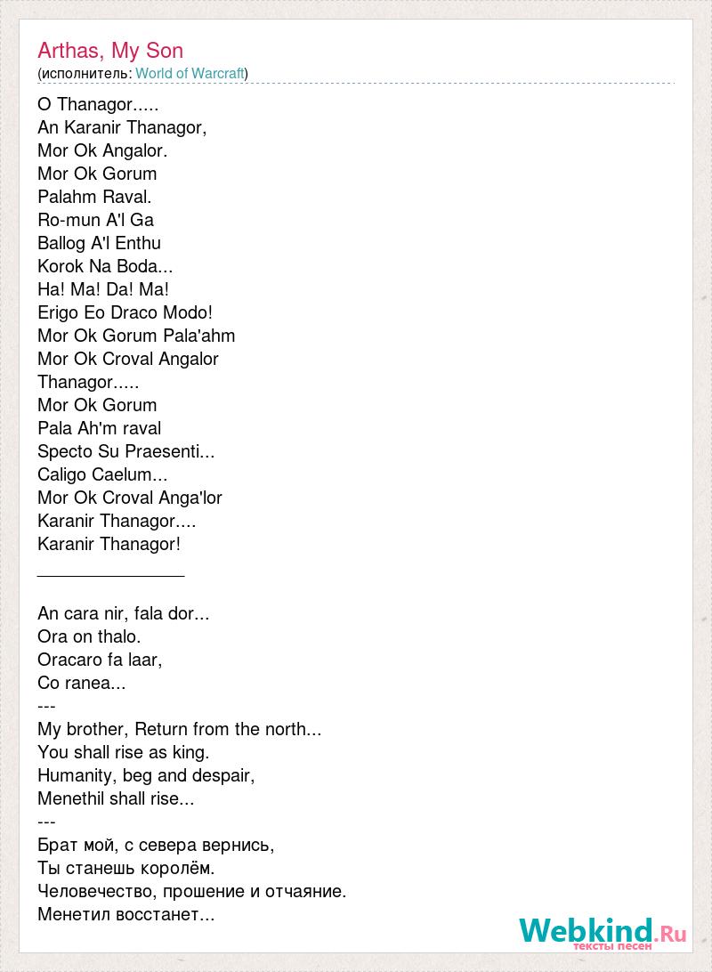 O Thanagor..... An Karanir Thanagor, Mor Ok Angalor. Mor Ok Gorum Palahm Raval. Ro-mun A'l Ga Ballog A'l Enthu Korok Na Boda... Ha! Ma! Da! Ma! Erigo Eo Draco Modo! Mor Ok Gorum Pala'ahm Mor Ok Croval Angalor Thanagor..... Mor Ok Gorum Pala Ah'm raval Specto Su Praesenti... Caligo Caelum... Mor Ok Croval Anga'lor Karanir Thanagor.... Karanir Thanagor! _______________ An cara nir, fala dor... Ora on thalo. Oracaro fa laar, Co ranea... --- My brother, Return from the north... You shall rise as king. Humanity, beg and despair, Menethil shall rise... --- Брат мой, с севера вернись, Ты станешь королём. Человечество, прошение и отчаяние. Менетил восстанет...