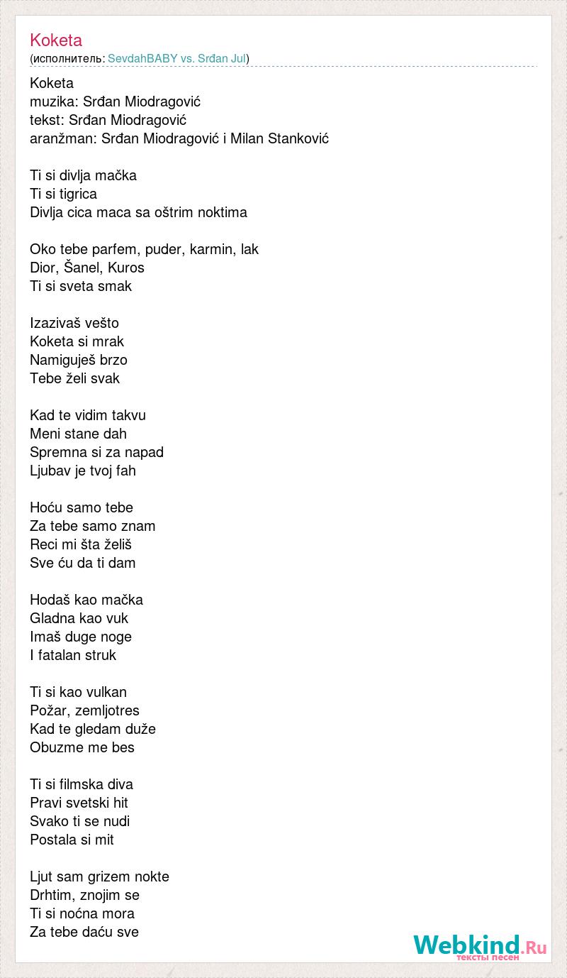 Koketa muzika: Srđan Miodragović tekst: Srđan Miodragović aranžman: Srđan Miodragović i Milan Stanković Ti si divlja mačka Ti si tigrica Divlja cica maca sa oštrim noktima Oko tebe parfem, puder, karmin, lak Dior, Šanel, Kuros Ti si sveta smak Izazivaš vešto Koketa si mrak Namiguješ brzo Tebe želi svak Kad te vidim takvu Meni stane dah Spremna si za napad Ljubav je tvoj fah Hoću samo tebe Za tebe samo znam Reci mi šta želiš Sve ću da ti dam Hodaš kao mačka Gladna kao vuk Imaš duge noge I fatalan struk Ti si kao vulkan Požar, zemljotres Kad te gledam duže Obuzme me bes Ti si filmska diva Pravi svetski hit Svako ti se nudi Postala si mit Ljut sam grizem nokte Drhtim, znojim se Ti si noćna mora Za tebe daću sve