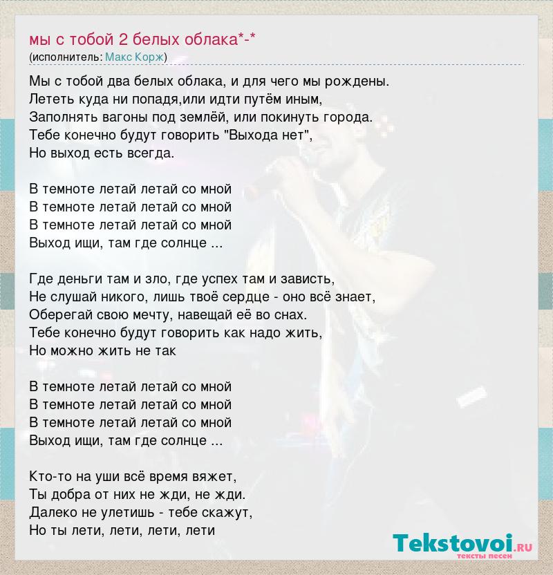 Мы с тобой два белых облака, и для чего мы рождены. Лететь куда ни попадя,или идти путём иным, Заполнять вагоны под землёй, или покинуть города. Тебе конечно будут говорить "Выхода нет", Но выход есть всегда. В темноте летай летай со мной В темноте летай летай со мной В темноте летай летай со мной Выход ищи, там где солнце ... Где деньги там и зло, где успех там и зависть, Не слушай никого, лишь твоё сердце - оно всё знает, Оберегай свою мечту, навещай её во снах. Тебе конечно будут говорить как надо жить, Но можно жить не так В темноте летай летай со мной В темноте летай летай со мной В темноте летай летай со мной Выход ищи, там где солнце ... Кто-то на уши всё время вяжет, Ты добра от них не жди, не жди. Далеко не улетишь - тебе скажут, Но ты лети, лети, лети, лети