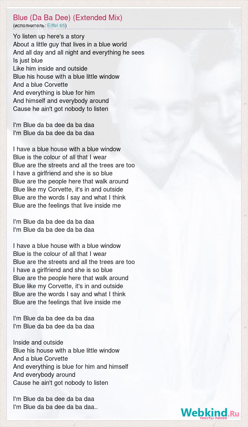 Yo listen up here's a story About a little guy that lives in a blue world And all day and all night and everything he sees Is just blue Like him inside and outside Blue his house with a blue little window And a blue Corvette And everything is blue for him And himself and everybody around Cause he ain't got nobody to listen I'm Blue da ba dee da ba daa I'm Blue da ba dee da ba daa I have a blue house with a blue window Blue is the colour of all that I wear Blue are the streets and all the trees are too I have a girlfriend and she is so blue Blue are the people here that walk around Blue like my Corvette, it's in and outside Blue are the words I say and what I think Blue are the feelings that live inside me I'm Blue da ba dee da ba daa I'm Blue da ba dee da ba daa I have a blue house with a blue window Blue is the colour of all that I wear Blue are the streets and all the trees are too I have a girlfriend and she is so blue Blue are the people here that walk around Blue like my Corvette, it's in and outside Blue are the words I say and what I think Blue are the feelings that live inside me I'm Blue da ba dee da ba daa I'm Blue da ba dee da ba daa Inside and outside Blue his house with a blue little window And a blue Corvette And everything is blue for him and himself And everybody around Cause he ain't got nobody to listen I'm Blue da ba dee da ba daa I'm Blue da ba dee da ba daa..