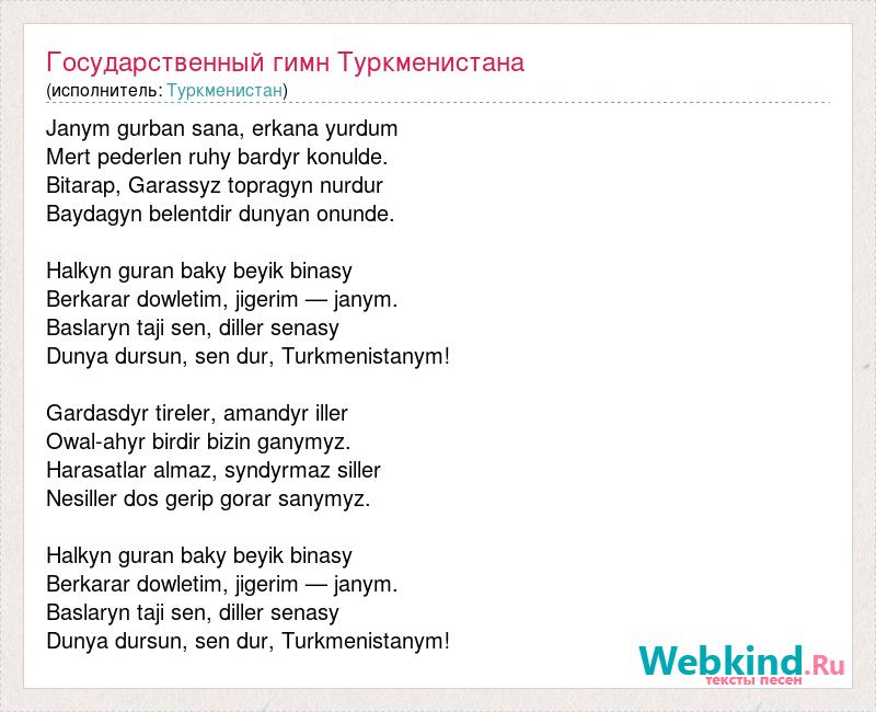 Janym gurban sana, erkana yurdum Mert pederlen ruhy bardyr konulde. Bitarap, Garassyz topragyn nurdur Baydagyn belentdir dunyan onunde. Halkyn guran baky beyik binasy Berkarar dowletim, jigerim — janym. Baslaryn taji sen, diller senasy Dunya dursun, sen dur, Turkmenistanym! Gardasdyr tireler, amandyr iller Owal-ahyr birdir bizin ganymyz. Harasatlar almaz, syndyrmaz siller Nesiller dos gerip gorar sanymyz. Halkyn guran baky beyik binasy Berkarar dowletim, jigerim — janym. Baslaryn taji sen, diller senasy Dunya dursun, sen dur, Turkmenistanym!