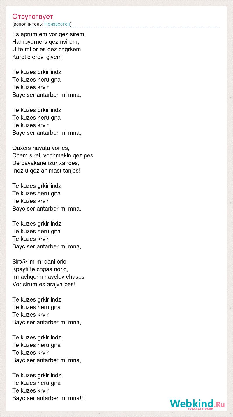 Es aprum em vor qez sirem, Hambyurners qez nvirem, U te mi or es qez chgrkem Karotic erevi gjvem Te kuzes grkir indz Te kuzes heru gna Te kuzes krvir Bayc ser antarber mi mna, Te kuzes grkir indz Te kuzes heru gna Te kuzes krvir Bayc ser antarber mi mna, Qaxcrs havata vor es, Chem sirel, vochmekin qez pes De bavakane izur xandes, Indz u qez animast tanjes! Te kuzes grkir indz Te kuzes heru gna Te kuzes krvir Bayc ser antarber mi mna, Te kuzes grkir indz Te kuzes heru gna Te kuzes krvir Bayc ser antarber mi mna, Sirt@ im mi qani oric Kpayti te chgas noric, Im achqerin nayelov chases Vor sirum es arajva pes! Te kuzes grkir indz Te kuzes heru gna Te kuzes krvir Bayc ser antarber mi mna, Te kuzes grkir indz Te kuzes heru gna Te kuzes krvir Bayc ser antarber mi mna, Te kuzes grkir indz Te kuzes heru gna Te kuzes krvir Bayc ser antarber mi mna!!!