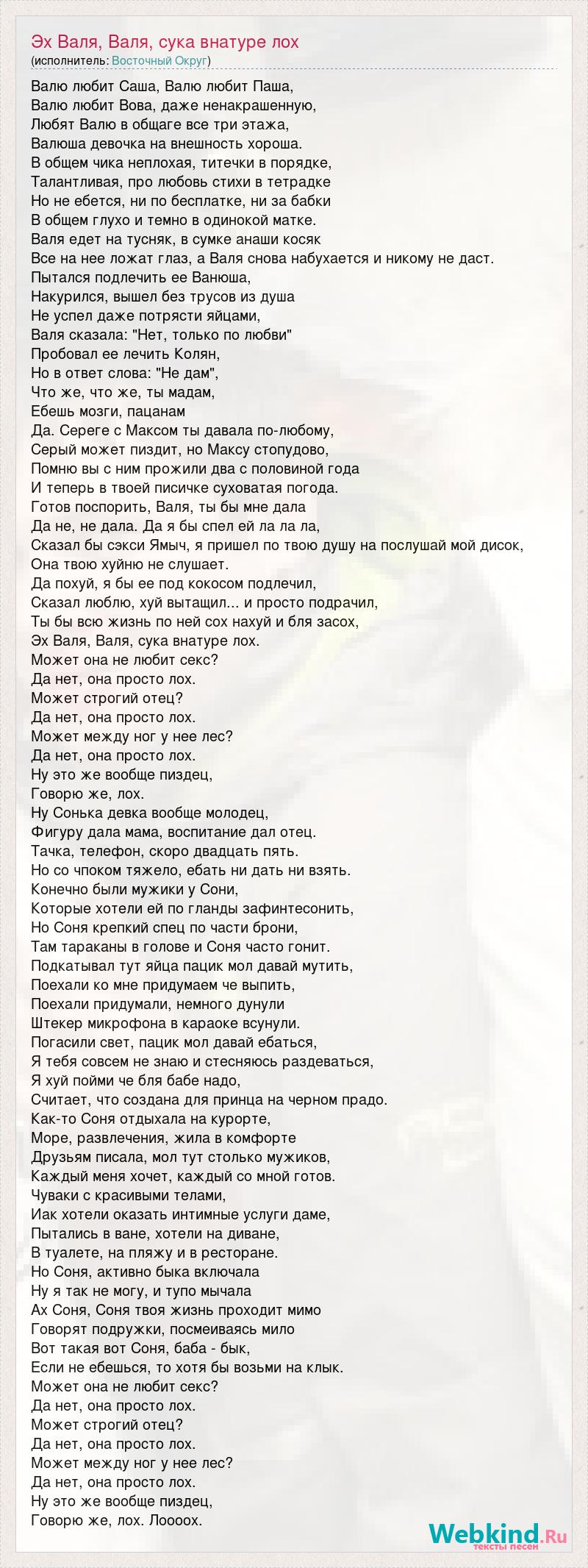 Валю любит Саша, Валю любит Паша, Валю любит Вова, даже ненакрашенную, Любят Валю в общаге все три этажа, Валюша девочка на внешность хороша. В общем чика неплохая, титечки в порядке, Талантливая, про любовь стихи в тетрадке Но не ебется, ни по бесплатке, ни за бабки В общем глухо и темно в одинокой матке. Валя едет на тусняк, в сумке анаши косяк Все на нее ложат глаз, а Валя снова набухается и никому не даст. Пытался подлечить ее Ванюша, Накурился, вышел без трусов из душа Не успел даже потрясти яйцами, Валя сказала: "Нет, только по любви" Пробовал ее лечить Колян, Но в ответ слова: "Не дам", Что же, что же, ты мадам, Ебешь мозги, пацанам Да. Сереге с Максом ты давала по-любому, Серый может пиздит, но Максу стопудово, Помню вы с ним прожили два с половиной года И теперь в твоей писичке суховатая погода. Готов поспорить, Валя, ты бы мне дала Да не, не дала. Да я бы спел ей ла ла ла, Сказал бы сэкси Ямыч, я пришел по твою душу на послушай мой дисок, Она твою хуйню не слушает. Да похуй, я бы ее под кокосом подлечил, Сказал люблю, хуй вытащил... и просто подрачил, Ты бы всю жизнь по ней сох нахуй и бля засох, Эх Валя, Валя, сука внатуре лох. Может она не любит секс? Да нет, она просто лох. Может строгий отец? Да нет, она просто лох. Может между ног у нее лес? Да нет, она просто лох. Ну это же вообще пиздец, Говорю же, лох. Ну Сонька девка вообще молодец, Фигуру дала мама, воспитание дал отец. Тачка, телефон, скоро двадцать пять. Но со чпоком тяжело, ебать ни дать ни взять. Конечно были мужики у Сони, Которые хотели ей по гланды зафинтесонить, Но Соня крепкий спец по части брони, Там тараканы в голове и Соня часто гонит. Подкатывал тут яйца пацик мол давай мутить, Поехали ко мне придумаем че выпить, Поехали придумали, немного дунули Штекер микрофона в караоке всунули. Погасили свет, пацик мол давай ебаться, Я тебя совсем не знаю и стесняюсь раздеваться, Я хуй пойми че бля бабе надо, Считает, что создана для принца на черном прадо. Как-то Соня отдыхала на курорте, Море, развлечения, жила в комфорте Друзьям писала, мол тут столько мужиков, Каждый меня хочет, каждый со мной готов. Чуваки с красивыми телами, Иак хотели оказать интимные услуги даме, Пытались в ване, хотели на диване, В туалете, на пляжу и в ресторане. Но Соня, активно быка включала Ну я так не могу, и тупо мычала Ах Соня, Соня твоя жизнь проходит мимо Говорят подружки, посмеиваясь мило Вот такая вот Соня, баба - бык, Если не ебешься, то хотя бы возьми на клык. Может она не любит секс? Да нет, она просто лох. Может строгий отец? Да нет, она просто лох. Может между ног у нее лес? Да нет, она просто лох. Ну это же вообще пиздец, Говорю же, лох. Лоооох.