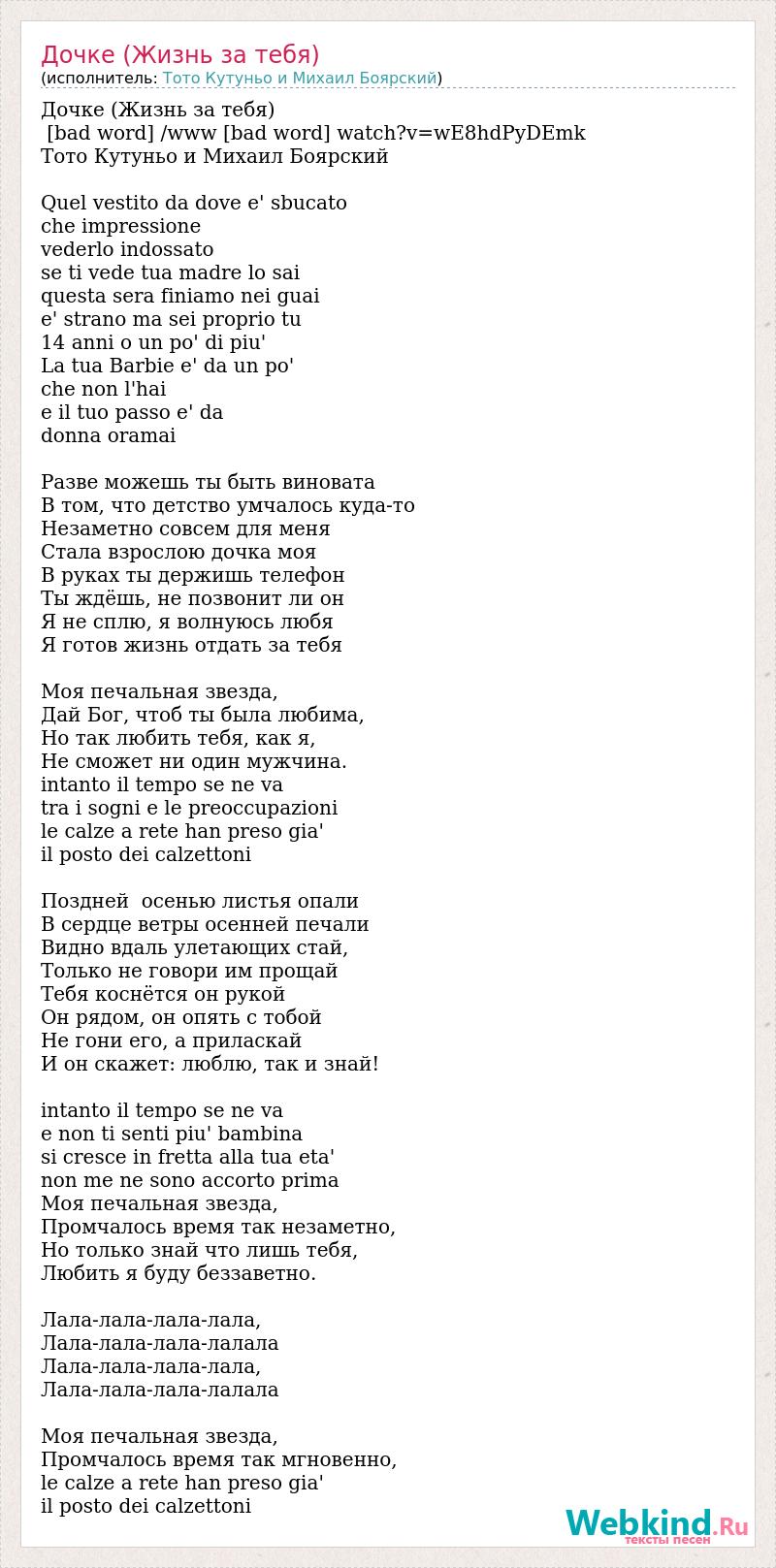 Дочке (Жизнь за тебя) [bad word] /www [bad word] watch?v=wE8hdPyDEmk Тото Кутуньо и Михаил Боярский Quel vestito da dove e' sbucato che impressione vederlo indossato se ti vede tua madre lo sai questa sera finiamo nei guai e' strano ma sei proprio tu 14 anni o un po' di piu' La tua Barbie e' da un po' che non l'hai e il tuo passo e' da donna oramai Разве можешь ты быть виновата В том, что детство умчалось куда-то Незаметно совсем для меня Стала взрослою дочка моя В руках ты держишь телефон Ты ждёшь, не позвонит ли он Я не сплю, я волнуюсь любя Я готов жизнь отдать за тебя Моя печальная звезда, Дай Бог, чтоб ты была любима, Но так любить тебя, как я, Не сможет ни один мужчина. intanto il tempo se ne va tra i sogni e le preoccupazioni le calze a rete han preso gia' il posto dei calzettoni Поздней осенью листья опали В сердце ветры осенней печали Видно вдаль улетающих стай, Только не говори им прощай Тебя коснётся он рукой Он рядом, он опять с тобой Не гони его, а приласкай И он скажет: люблю, так и знай! intanto il tempo se ne va e non ti senti piu' bambina si cresce in fretta alla tua eta' non me ne sono accorto prima Моя печальная звезда, Промчалось время так незаметно, Но только знай что лишь тебя, Любить я буду беззаветно. Лала-лала-лала-лала, Лала-лала-лала-лалала Лала-лала-лала-лала, Лала-лала-лала-лалала Моя печальная звезда, Промчалось время так мгновенно, le calze a rete han preso gia' il posto dei calzettoni