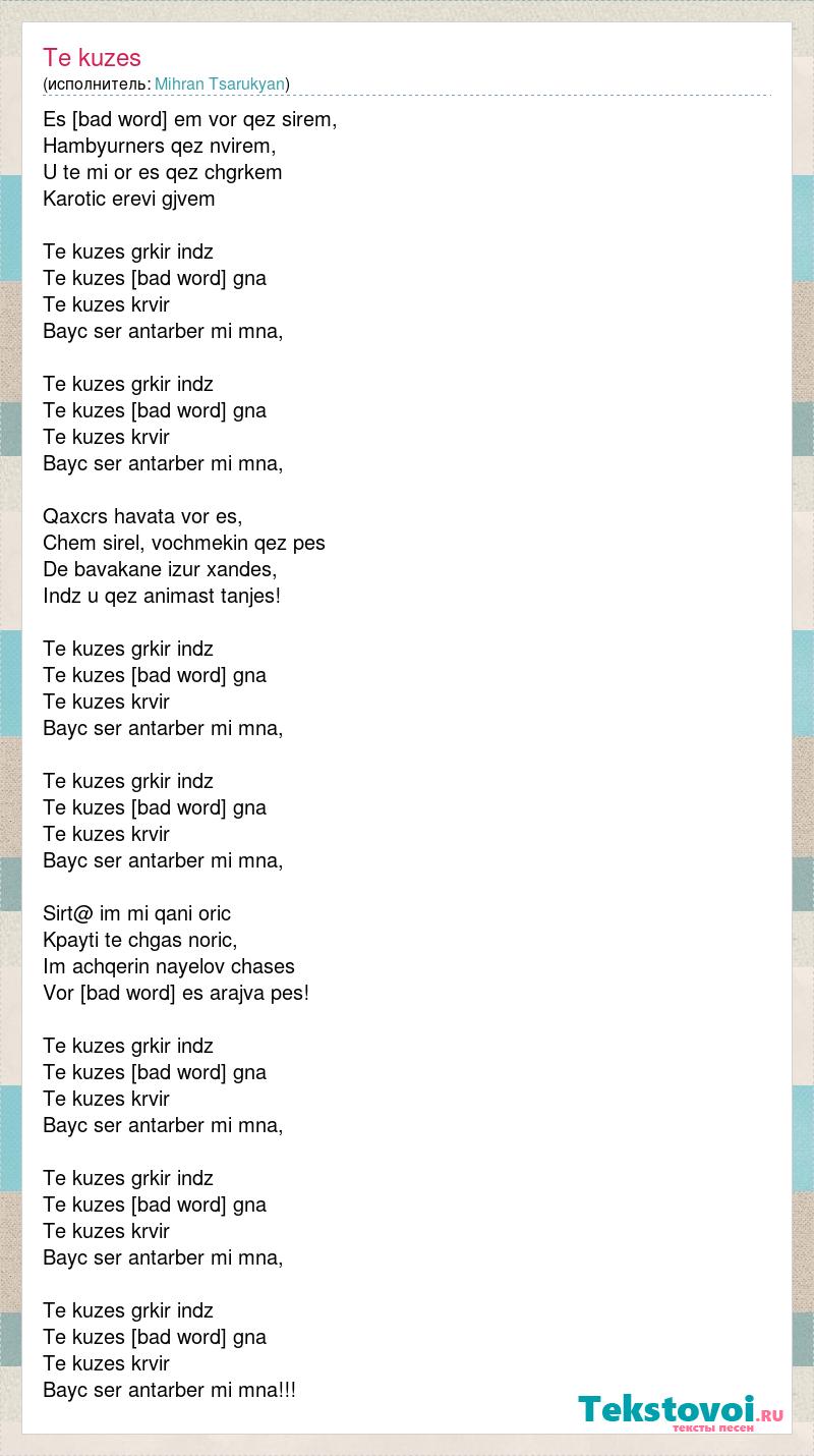 Es [bad word] em vor qez sirem, Hambyurners qez nvirem, U te mi or es qez chgrkem Karotic erevi gjvem Te kuzes grkir indz Te kuzes [bad word] gna Te kuzes krvir Bayc ser antarber mi mna, Te kuzes grkir indz Te kuzes [bad word] gna Te kuzes krvir Bayc ser antarber mi mna, Qaxcrs havata vor es, Chem sirel, vochmekin qez pes De bavakane izur xandes, Indz u qez animast tanjes! Te kuzes grkir indz Te kuzes [bad word] gna Te kuzes krvir Bayc ser antarber mi mna, Te kuzes grkir indz Te kuzes [bad word] gna Te kuzes krvir Bayc ser antarber mi mna, Sirt@ im mi qani oric Kpayti te chgas noric, Im achqerin nayelov chases Vor [bad word] es arajva pes! Te kuzes grkir indz Te kuzes [bad word] gna Te kuzes krvir Bayc ser antarber mi mna, Te kuzes grkir indz Te kuzes [bad word] gna Te kuzes krvir Bayc ser antarber mi mna, Te kuzes grkir indz Te kuzes [bad word] gna Te kuzes krvir Bayc ser antarber mi mna!!!