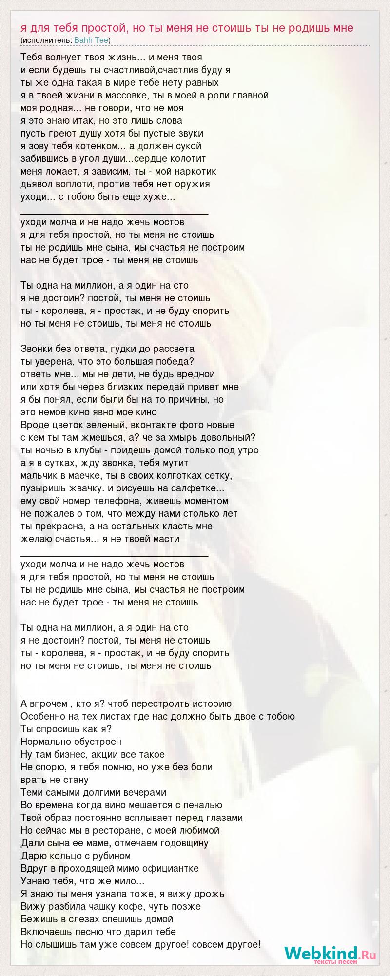 Тебя волнует твоя жизнь... и меня твоя и если будешь ты счастливой,счастлив буду я ты же одна такая в мире тебе нету равных я в твоей жизни в массовке, ты в моей в роли главной моя родная... не говори, что не моя я это знаю итак, но это лишь слова пусть греют душу хотя бы пустые звуки я зову тебя котенком... а должен сукой забившись в угол души...сердце колотит меня ломает, я зависим, ты - мой наркотик дьявол воплоти, против тебя нет оружия уходи... с тобою быть еще хуже... ___________________________________ уходи молча и не надо жечь мостов я для тебя простой, но ты меня не стоишь ты не родишь мне сына, мы счастья не построим нас не будет трое - ты меня не стоишь Ты одна на миллион, а я один на сто я не достоин? постой, ты меня не стоишь ты - королева, я - простак, и не буду спорить но ты меня не стоишь, ты меня не стоишь ____________________________________ Звонки без ответа, гудки до рассвета ты уверена, что это большая победа? ответь мне... мы не дети, не будь вредной или хотя бы через близких передай привет мне я бы понял, если были бы на то причины, но это немое кино явно мое кино Вроде цветок зеленый, вконтакте фото новые с кем ты там жмешься, а? че за хмырь довольный? ты ночью в клубы - придешь домой только под утро а я в сутках, жду звонка, тебя мутит мальчик в маечке, ты в своих колготках сетку, пузыришь жвачку. и рисуешь на салфетке... ему свой номер телефона, живешь моментом не пожалев о том, что между нами столько лет ты прекрасна, а на остальных класть мне желаю счастья... я не твоей масти ___________________________________ уходи молча и не надо жечь мостов я для тебя простой, но ты меня не стоишь ты не родишь мне сына, мы счастья не построим нас не будет трое - ты меня не стоишь Ты одна на миллион, а я один на сто я не достоин? постой, ты меня не стоишь ты - королева, я - простак, и не буду спорить но ты меня не стоишь, ты меня не стоишь ___________________________________ А впрочем , кто я? чтоб перестроить историю Особенно на тех листах где нас должно быть двое с тобою Ты спросишь как я? Нормально обустроен Ну там бизнес, акции все такое Не спорю, я тебя помню, но уже без боли врать не стану Теми самыми долгими вечерами Во времена когда вино мешается с печалью Твой образ постоянно всплывает перед глазами Но сейчас мы в ресторане, с моей любимой Дали сына ее маме, отмечаем годовщину Дарю кольцо с рубином Вдруг в проходящей мимо официантке Узнаю тебя, что же мило... Я знаю ты меня узнала тоже, я вижу дрожь Вижу разбила чашку кофе, чуть позже Бежишь в слезах спешишь домой Включаешь песню что дарил тебе Но слышишь там уже совсем другое! совсем другое!