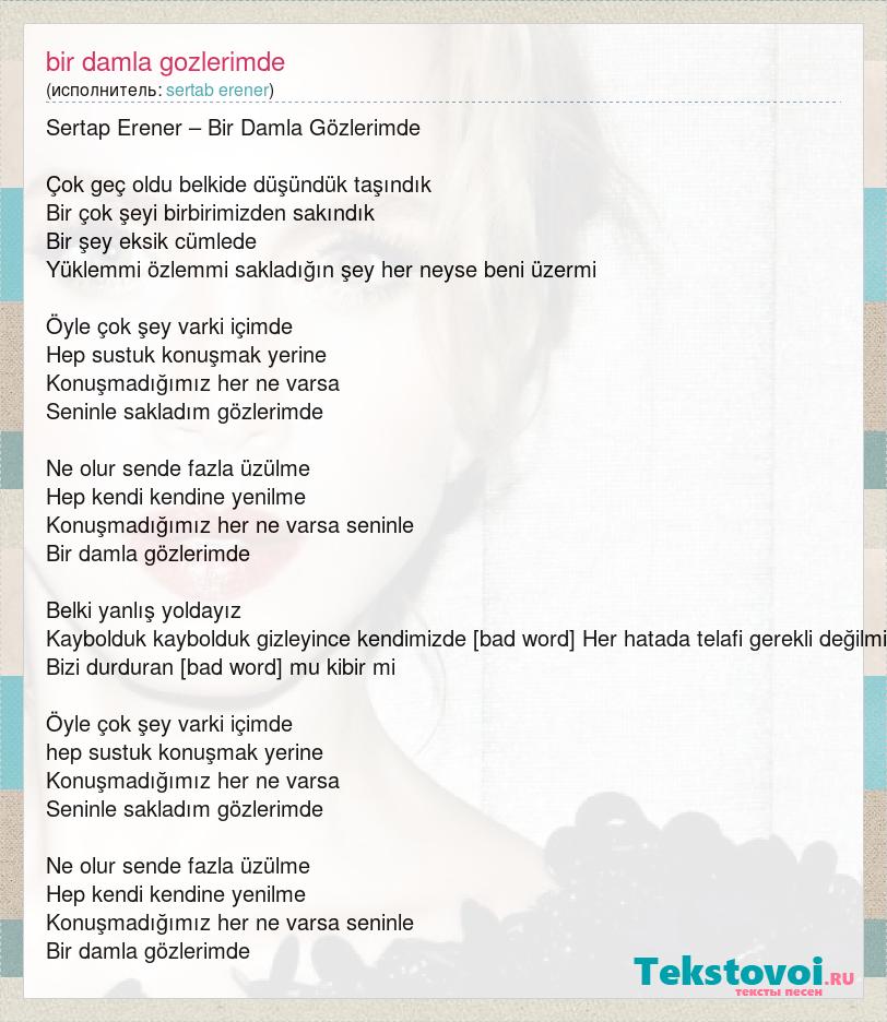 Sertap Erener – Bir Damla Gözlerimde Çok geç oldu belkide düşündük taşındık Bir çok şeyi birbirimizden sakındık Bir şey eksik cümlede Yüklemmi özlemmi sakladığın şey her neyse beni üzermi Öyle çok şey varki içimde Hep sustuk konuşmak yerine Konuşmadığımız her ne varsa Seninle sakladım gözlerimde Ne olur sende fazla üzülme Hep kendi kendine yenilme Konuşmadığımız her ne varsa seninle Bir damla gözlerimde Belki yanlış yoldayız Kaybolduk kaybolduk gizleyince kendimizde yorulduk Her hatada telafi gerekli değilmi Bizi durduran gurur mu kibir mi Öyle çok şey varki içimde hep sustuk konuşmak yerine Konuşmadığımız her ne varsa Seninle sakladım gözlerimde Ne olur sende fazla üzülme Hep kendi kendine yenilme Konuşmadığımız her ne varsa seninle Bir damla gözlerimde