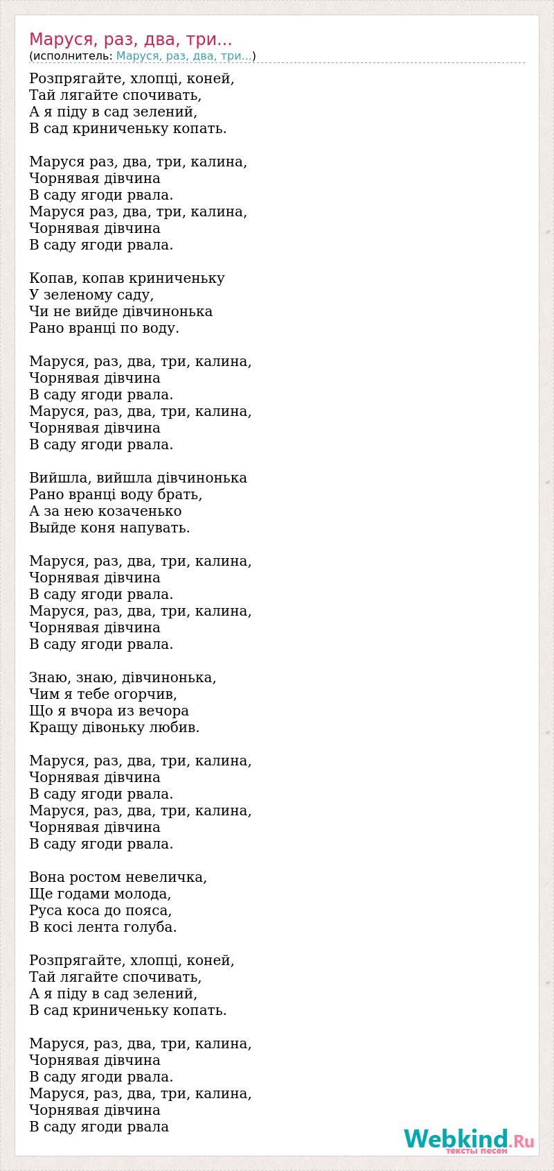 Розпрягайте, хлопцi, коней, Тай лягайте спочивать, А я пiду в сад зелений, В сад криниченьку копать. Маруся раз, два, три, калина, Чорнявая дiвчина В саду ягоди рвала. Маруся раз, два, три, калина, Чорнявая дiвчина В саду ягоди рвала. Копав, копав криниченьку У зеленому саду, Чи не вийде дiвчинонька Рано вранцi по воду. Маруся, раз, два, три, калина, Чорнявая дiвчина В саду ягоди рвала. Маруся, раз, два, три, калина, Чорнявая дiвчина В саду ягоди рвала. Вийшла, вийшла дiвчинонька Рано вранцi воду брать, А за нею козаченько Выйде коня напувать. Маруся, раз, два, три, калина, Чорнявая дiвчина В саду ягоди рвала. Маруся, раз, два, три, калина, Чорнявая дiвчина В саду ягоди рвала. Знаю, знаю, дiвчинонька, Чим я тебе огорчив, Що я вчора из вечора Кращу дiвоньку любив. Маруся, раз, два, три, калина, Чорнявая дiвчина В саду ягоди рвала. Маруся, раз, два, три, калина, Чорнявая дiвчина В саду ягоди рвала. Вона ростом невеличка, Ще годами молода, Руса коса до пояса, В косi лента голуба. Розпрягайте, хлопцi, коней, Тай лягайте спочивать, А я пiду в сад зелений, В сад криниченьку копать. Маруся, раз, два, три, калина, Чорнявая дiвчина В саду ягоди рвала. Маруся, раз, два, три, калина, Чорнявая дiвчина В саду ягоди рвала