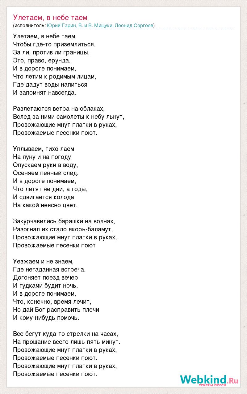 Улетаем, в небе таем, Чтобы где-то приземлиться. За ли, против ли границы, Это, право, ерунда. И в дороге понимаем, Что летим к родимым лицам, Где дадут воды напиться И запомнят навсегда. Разлетаются ветра на облаках, Вслед за ними самолеты к небу льнут, Провожающие мнут платки в руках, Провожаемые песенки поют. Уплываем, тихо лаем На луну и на погоду Опускаем руки в воду, Осеняем пенный след. И в дороге понимаем, Что летят не дни, а годы, И сдвигается колода На какой неясно цвет. Закурчавились барашки на волнах, Разогнал их стадо якорь-баламут, Провожающие мнут платки в руках, Провожаемые песенки поют Уезжаем и не знаем, Где негаданная встреча. Догоняет поезд вечер И гудками будит ночь. И в дороге понимаем, Что, конечно, время лечит, Но дай Бог расправить плечи И кому-нибудь помочь. Все бегут куда-то стрелки на часах, На прощание всего лишь пять минут. Провожающие мнут платки в руках, Провожаемые песенки поют. Провожающие мнут платки в руках, Провожаемые песенки поют.