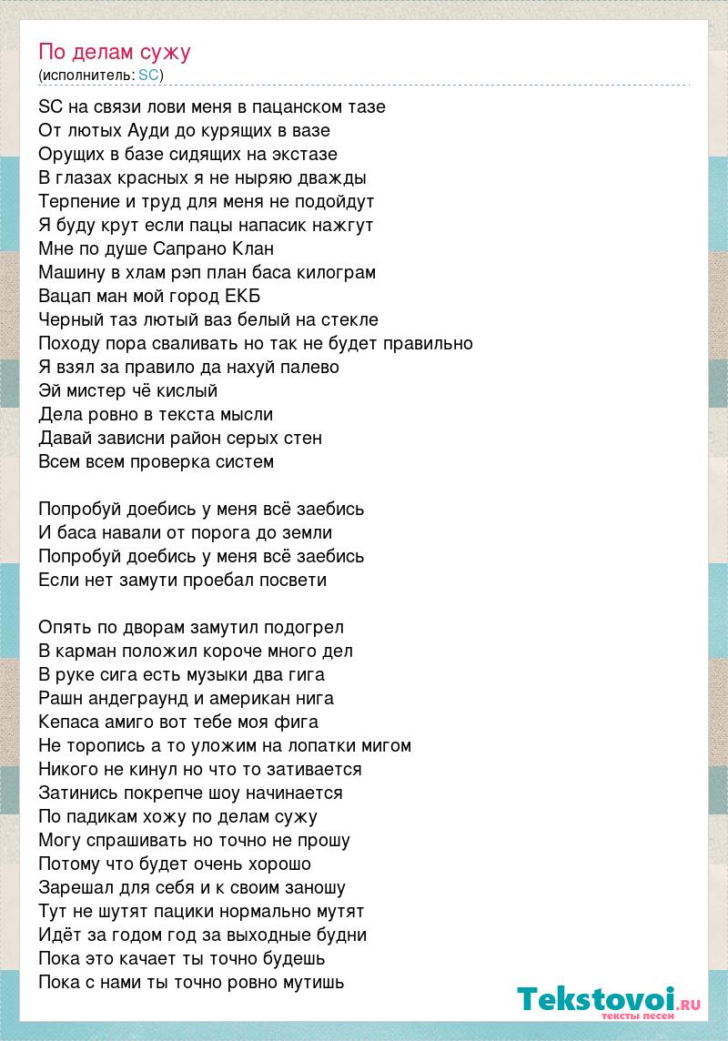 SC на связи лови меня в пацанском тазе От лютых Ауди до курящих в вазе Орущих в базе сидящих на экстазе В глазах красных я не ныряю дважды Терпение и труд для меня не подойдут Я буду крут если пацы напасик нажгут Мне по душе Сапрано Клан Машину в хлам рэп план баса килограм Вацап ман мой город ЕКБ Черный таз лютый ваз белый на стекле Походу пора сваливать но так не будет правильно Я взял за правило да нахуй палево Эй мистер чё кислый Дела ровно в текста мысли Давай зависни район серых стен Всем всем проверка систем Попробуй доебись у меня всё заебись И баса навали от порога до земли Попробуй доебись у меня всё заебись Если нет замути проебал посвети Опять по дворам замутил подогрел В карман положил короче много дел В руке сига есть музыки два гига Рашн андеграунд и американ нига Кепаса амиго вот тебе моя фига Не торопись а то уложим на лопатки мигом Никого не кинул но что то зативается Затинись покрепче шоу начинается По падикам хожу по делам сужу Могу спрашивать но точно не прошу Потому что будет очень хорошо Зарешал для себя и к своим заношу Тут не шутят пацики нормально мутят Идёт за годом год за выходные будни Пока это качает ты точно будешь Пока с нами ты точно ровно мутишь