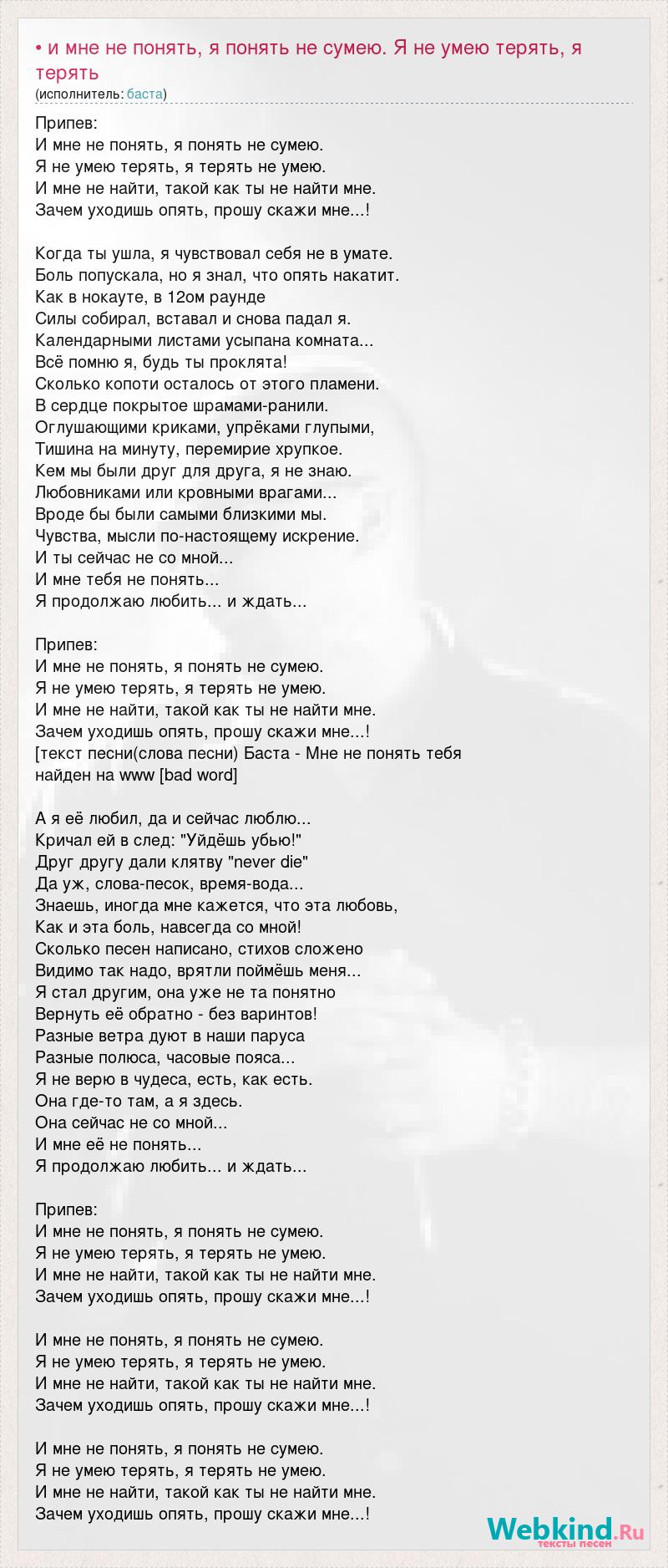 Припев: И мне не понять, я понять не сумею. Я не умею терять, я терять не умею. И мне не найти, такой как ты не найти мне. Зачем уходишь опять, прошу скажи мне...! Когда ты ушла, я чувствовал себя не в умате. Боль попускала, но я знал, что опять накатит. Как в нокауте, в 12ом раунде Силы собирал, вставал и снова падал я. Календарными листами усыпана комната... Всё помню я, будь ты проклята! Сколько копоти осталось от этого пламени. В сердце покрытое шрамами-ранили. Оглушающими криками, упрёками глупыми, Тишина на минуту, перемирие хрупкое. Кем мы были друг для друга, я не знаю. Любовниками или кровными врагами... Вроде бы были самыми близкими мы. Чувства, мысли по-настоящему искрение. И ты сейчас не со мной... И мне тебя не понять... Я продолжаю любить... и ждать... Припев: И мне не понять, я понять не сумею. Я не умею терять, я терять не умею. И мне не найти, такой как ты не найти мне. Зачем уходишь опять, прошу скажи мне...! [текст песни(слова песни) Баста - Мне не понять тебя найден на www [bad word] А я её любил, да и сейчас люблю... Кричал ей в след: "Уйдёшь убью!" Друг другу дали клятву "never die" Да уж, слова-песок, время-вода... Знаешь, иногда мне кажется, что эта любовь, Как и эта боль, навсегда со мной! Сколько песен написано, стихов сложено Видимо так надо, врятли поймёшь меня... Я стал другим, она уже не та понятно Вернуть её обратно - без варинтов! Разные ветра дуют в наши паруса Разные полюса, часовые пояса... Я не верю в чудеса, есть, как есть. Она где-то там, а я здесь. Она сейчас не со мной... И мне её не понять... Я продолжаю любить... и ждать... Припев: И мне не понять, я понять не сумею. Я не умею терять, я терять не умею. И мне не найти, такой как ты не найти мне. Зачем уходишь опять, прошу скажи мне...! И мне не понять, я понять не сумею. Я не умею терять, я терять не умею. И мне не найти, такой как ты не найти мне. Зачем уходишь опять, прошу скажи мне...! И мне не понять, я понять не сумею. Я не умею терять, я терять не умею. И мне не найти, такой как ты не найти мне. Зачем уходишь опять, прошу скажи мне...!