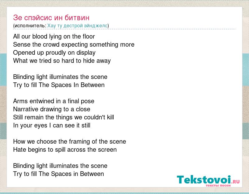 All our blood lying on the floor Sense the crowd expecting something more Opened up proudly on display What we tried so hard to hide away Blinding light illuminates the scene Try to fill The Spaces In Between Arms entwined in a final pose Narrative drawing to a close Still remain the things we couldn't kill In your eyes I can see it still How we choose the framing of the scene Hate begins to spill across the screen Blinding light illuminates the scene Try to fill The Spaces in Between