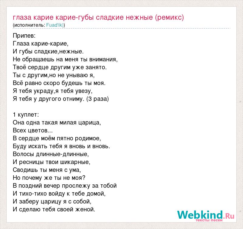 Припев: Глаза карие-карие, И губы сладкие,нежные. Не обращаешь на меня ты внимания, Твоё сердце другим уже занято. Ты с другим,но не унываю я, Всё равно скоро будешь ты моя. Я тебя украду,я тебя увезу, Я тебя у другого отниму. (3 раза) 1 куплет: Она одна такая милая царица, Всех цветов... В сердце моём пятно родимое, Буду искать тебя я вновь и вновь. Волосы длинные-длинные, И ресницы твои шикарные, Сводишь ты меня с ума, Но почему же ты не моя? В поздний вечер прослежу за тобой И тихо-тихо войду к тебе домой, И заберу царицу я с собой, И сделаю тебя своей женой.