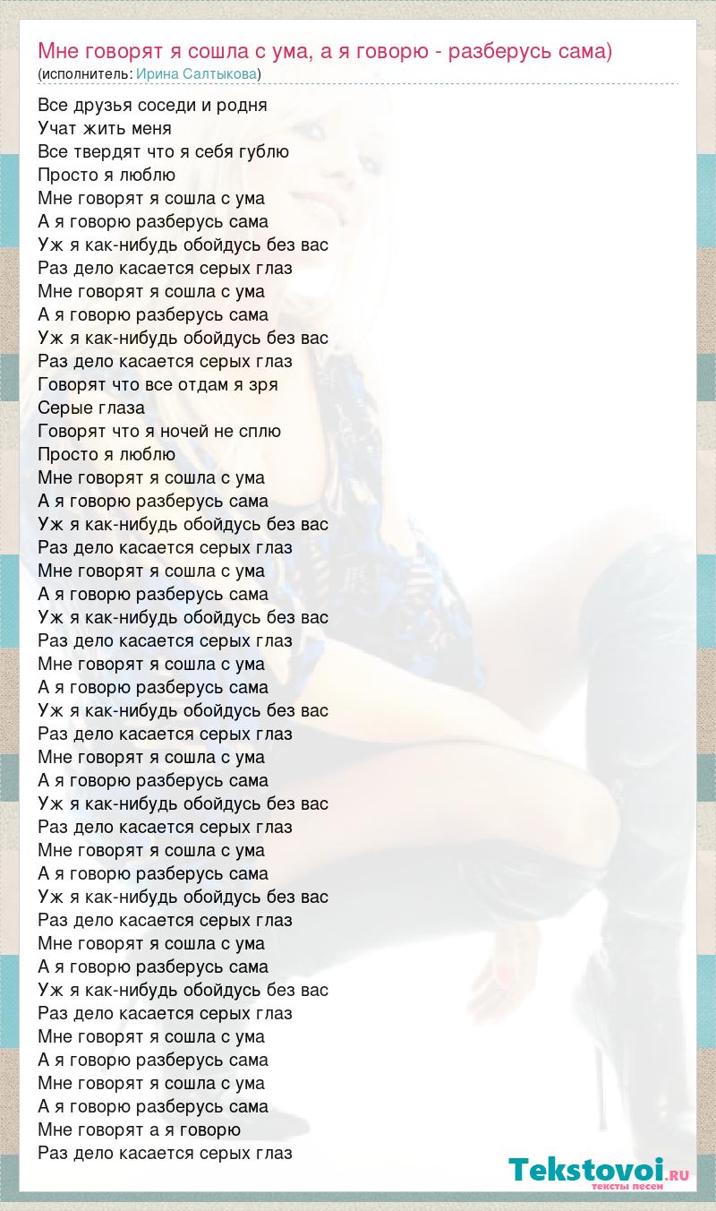 Все друзья соседи и родня Учат жить меня Все твердят что я себя гублю Просто я люблю Мне говорят я сошла с ума А я говорю разберусь сама Уж я как-нибудь обойдусь без вас Раз дело касается серых глаз Мне говорят я сошла с ума А я говорю разберусь сама Уж я как-нибудь обойдусь без вас Раз дело касается серых глаз Говорят что все отдам я зря Серые глаза Говорят что я ночей не сплю Просто я люблю Мне говорят я сошла с ума А я говорю разберусь сама Уж я как-нибудь обойдусь без вас Раз дело касается серых глаз Мне говорят я сошла с ума А я говорю разберусь сама Уж я как-нибудь обойдусь без вас Раз дело касается серых глаз Мне говорят я сошла с ума А я говорю разберусь сама Уж я как-нибудь обойдусь без вас Раз дело касается серых глаз Мне говорят я сошла с ума А я говорю разберусь сама Уж я как-нибудь обойдусь без вас Раз дело касается серых глаз Мне говорят я сошла с ума А я говорю разберусь сама Уж я как-нибудь обойдусь без вас Раз дело касается серых глаз Мне говорят я сошла с ума А я говорю разберусь сама Уж я как-нибудь обойдусь без вас Раз дело касается серых глаз Мне говорят я сошла с ума А я говорю разберусь сама Мне говорят я сошла с ума А я говорю разберусь сама Мне говорят а я говорю Раз дело касается серых глаз