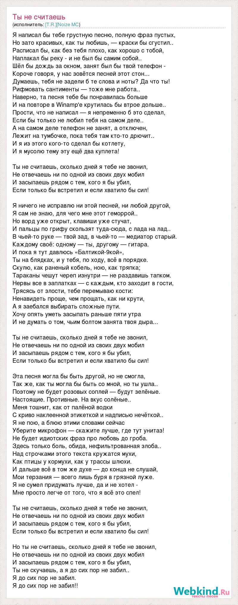 Я написал бы тебе грустную песню, полную фраз пустых, Но зато красивых, как ты любишь, — краски бы сгустил.. Расписал бы, как без тебя плохо, как хорошо с тобой, Наплакал бы реку - и не был бы самим собой.. Шёл бы дождь за окном, занят был бы твой телефон - Короче говоря, у нас зовётся песней этот стон... Думаешь, тебя не задели б те слова и ноты? Да что ты! Рифмовать сантименты — тоже мне работа.. Наверно, та песня тебе бы понравилась больше И на повторе в Winamp'е крутилась бы втрое дольше.. Прости, что не написал — я непременно б это сделал, Если бы только не любил тебя на самом деле.. А на самом деле телефон не занят, а отключен, Лежит на тумбочке, пока тебя там кто-то дрючит.. И я из этого кого-то сделал бы котлету, И я мусолю тему эту ещё два куплета! Ты не считаешь, сколько дней я тебе не звонил, Не отвечаешь ни по одной из своих двух мобил И засыпаешь рядом с тем, кого я бы убил, Если только бы встретил и если хватило бы сил! Я ничего не исправлю ни этой песней, ни любой другой, Я сам не знаю, для чего мне этот геморрой.. Но ворд уже открыт, клавиши уже стучат, И пальцы по грифу скользят туда-сюда, с лада на лад.. В чьей-то руке — твой зад, в чьей-то — медиатор старый. Каждому своё: одному — ты, другому — гитара. И пока я тут давлюсь «Балтикой-9кой», Ты на блядках, и у тебя, по ходу, всё в порядке. Скулю, как раненый кобель, ною, как тряпка; Тараканы чешут череп изнутри — не раздавишь тапком. Нервы все в заплатках — с каждым, кто заходит в гости, Трясясь от злости, тебе перемываю кости: Ненавидеть проще, чем прощать, как ни крути, А я заебался выбирать сложные пути. Хочу опять уметь засыпать раньше пяти утра И не думать о том, чьим болтом занята твоя дыра... Ты не считаешь, сколько дней я тебе не звонил, Не отвечаешь ни по одной из своих двух мобил И засыпаешь рядом с тем, кого я бы убил, Если только бы встретил и если хватило бы сил! Эта песня могла бы быть другой, но не смогла, Так же, как ты могла бы быть со мной, но ты ушла.. Поэтому не будет розовых соплей — будут зелёные. Настоящие. Противные. На вкус солёные.. Меня тошнит, как от палёной водки С криво наклеенной этикеткой и надписью нечёткой.. Я не пою, а блюю этими словами сейчас Уберите микрофон — скажите лучше, где тут унитаз! Не будет идиотских фраз про любовь до гроба. Здесь только боль, обида, нефильтрованная злоба.. Над строчками этого текста кружатся мухи, Как птицы у кормухи, как у трассы шлюхи. И дальше всё в том же духе — до конца не слушай, Мои терзания — всего лишь буря в грязной луже. Я не сумел придумать лучше, да и не хотел - Мне просто легче от того, что я всё это спел! Ты не считаешь, сколько дней я тебе не звонил, Не отвечаешь ни по одной из своих двух мобил И засыпаешь рядом с тем, кого я бы убил, Если только бы встретил и если хватило бы сил! Но ты не считаешь, сколько дней я тебе не звонил, Не отвечаешь ни по одной из своих двух мобил И засыпаешь рядом с тем, кого я бы убил, Ты не скучаешь, а я до сих пор не забил.. Я до сих пор не забил. Я до сих пор не забил!!