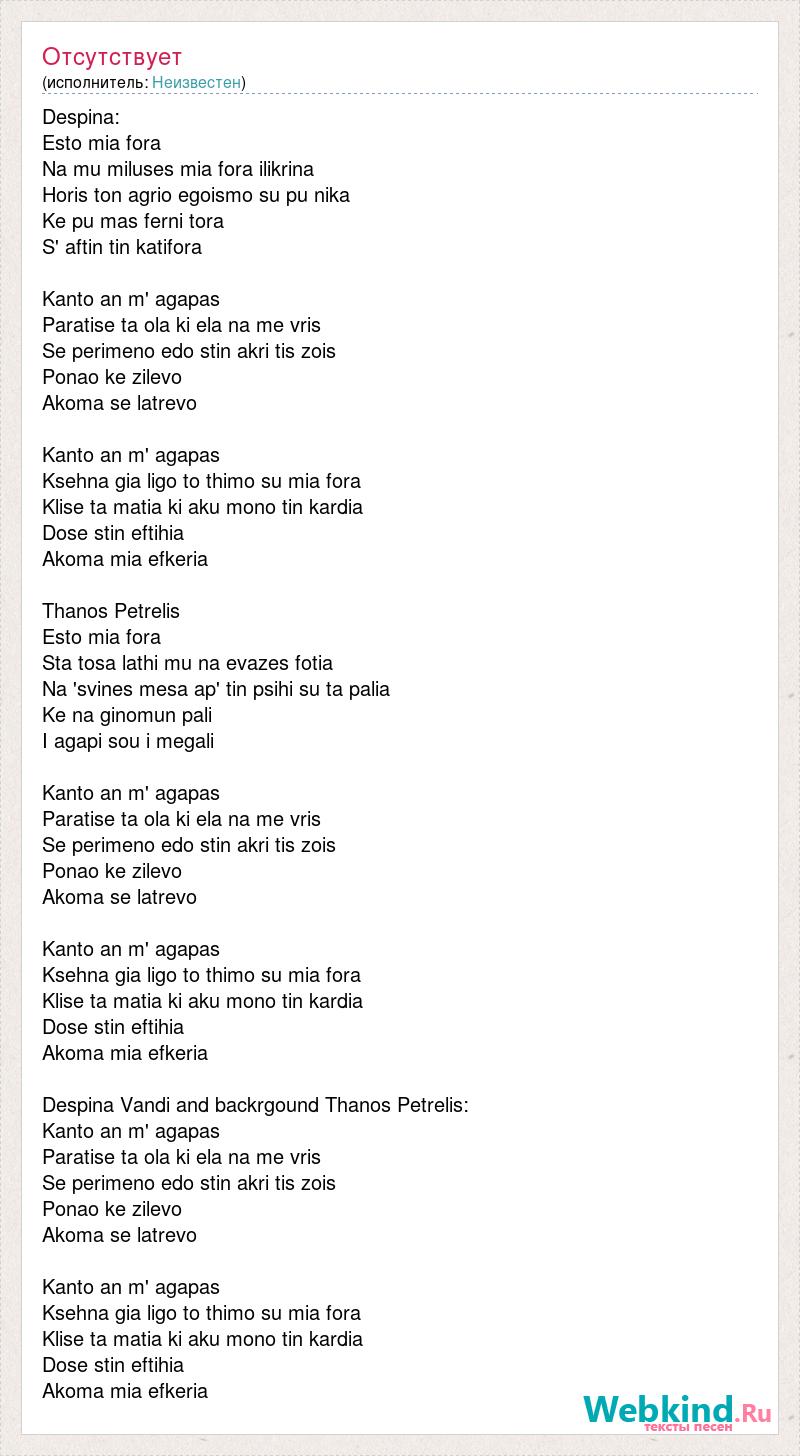 Despina: Esto mia fora Na mu miluses mia fora ilikrina Horis ton agrio egoismo su pu nika Ke pu mas ferni tora S' aftin tin katifora Kanto an m' agapas Paratise ta ola ki ela na me vris Se perimeno edo stin akri tis zois Ponao ke zilevo Akoma se latrevo Kanto an m' agapas Ksehna gia ligo to thimo su mia fora Klise ta matia ki aku mono tin kardia Dose stin eftihia Akoma mia efkeria Thanos Petrelis Esto mia fora Sta tosa lathi mu na evazes fotia Na 'svines mesa ap' tin psihi su ta palia Ke na ginomun pali I agapi sou i megali Kanto an m' agapas Paratise ta ola ki ela na me vris Se perimeno edo stin akri tis zois Ponao ke zilevo Akoma se latrevo Kanto an m' agapas Ksehna gia ligo to thimo su mia fora Klise ta matia ki aku mono tin kardia Dose stin eftihia Akoma mia efkeria Despina Vandi and backrgound Thanos Petrelis: Kanto an m' agapas Paratise ta ola ki ela na me vris Se perimeno edo stin akri tis zois Ponao ke zilevo Akoma se latrevo Kanto an m' agapas Ksehna gia ligo to thimo su mia fora Klise ta matia ki aku mono tin kardia Dose stin eftihia Akoma mia efkeria