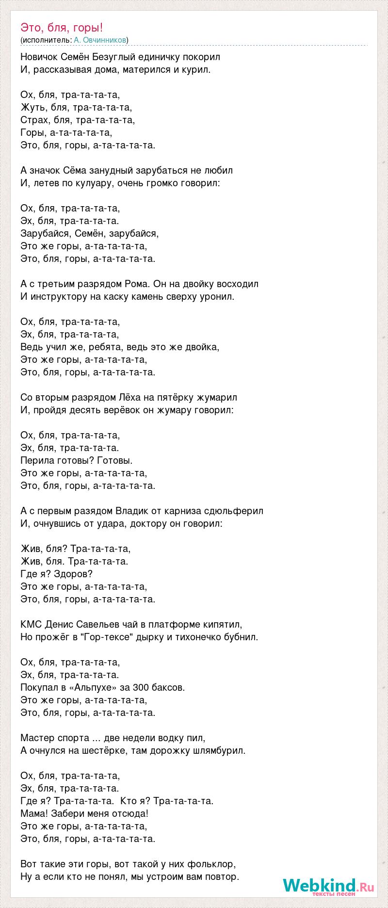 Новичок Семён Безуглый единичку покорил И, рассказывая дома, матерился и курил. Ох, бля, тра-та-та-та, Жуть, бля, тра-та-та-та, Страх, бля, тра-та-та-та, Горы, а-та-та-та-та, Это, бля, горы, а-та-та-та-та. А значок Сёма занудный зарубаться не любил И, летев по кулуару, очень громко говорил: Ох, бля, тра-та-та-та, Эх, бля, тра-та-та-та. Зарубайся, Семён, зарубайся, Это же горы, а-та-та-та-та, Это, бля, горы, а-та-та-та-та. А с третьим разрядом Рома. Он на двойку восходил И инструктору на каску камень сверху уронил. Ох, бля, тра-та-та-та, Эх, бля, тра-та-та-та, Ведь учил же, ребята, ведь это же двойка, Это же горы, а-та-та-та-та, Это, бля, горы, а-та-та-та-та. Со вторым разрядом Лёха на пятёрку жумарил И, пройдя десять верёвок он жумару говорил: Ох, бля, тра-та-та-та, Эх, бля, тра-та-та-та. Перила готовы? Готовы. Это же горы, а-та-та-та-та, Это, бля, горы, а-та-та-та-та. А с первым разядом Владик от карниза сдюльферил И, очнувшись от удара, доктору он говорил: Жив, бля? Тра-та-та-та, Жив, бля. Тра-та-та-та. Где я? Здоров? Это же горы, а-та-та-та-та, Это, бля, горы, а-та-та-та-та. КМС Денис Савельев чай в платформе кипятил, Но прожёг в "Гор-тексе" дырку и тихонечко бубнил. Ох, бля, тра-та-та-та, Эх, бля, тра-та-та-та. Покупал в «Альпухе» за 300 баксов. Это же горы, а-та-та-та-та, Это, бля, горы, а-та-та-та-та. Мастер спорта ... две недели водку пил, А очнулся на шестёрке, там дорожку шлямбурил. Ох, бля, тра-та-та-та, Эх, бля, тра-та-та-та. Где я? Тра-та-та-та. Кто я? Тра-та-та-та. Мама! Забери меня отсюда! Это же горы, а-та-та-та-та, Это, бля, горы, а-та-та-та-та. Вот такие эти горы, вот такой у них фольклор, Ну а если кто не понял, мы устроим вам повтор.
