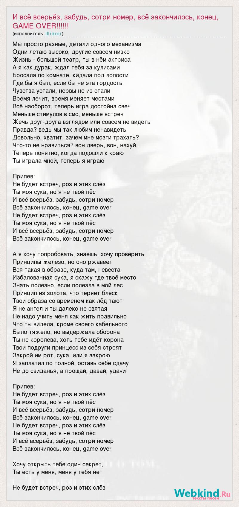 Мы просто разные, детали одного механизма Одни летаю высоко, другие совсем низко Жизнь - большой театр, ты в нём актриса А я как дурак, ждал тебя за кулисами Бросала по комнате, кидала под лопости Где бы я был, если бы не эта гордость Чувства устали, нервы не из стали Время лечит, время меняет местами Всё наоборот, теперь игра достойна свеч Меньше стимулов в смс, меньше встреч Жечь друг-друга взглядом или совсем не видеть Правда? ведь мы так любим ненавидеть Довольно, хватит, зачем мне мозги трахать? Что-то не нравиться? вон дверь, вон, нахуй, Теперь понятно, когда подошли к краю Ты играла мной, теперь я играю Припев: Не будет встреч, роз и этих слёз Ты моя сука, но я не твой пёс И всё всерьёз, забудь, сотри номер Всё закончилось, конец, game over Не будет встреч, роз и этих слёз Ты моя сука, но я не твой пёс И всё всерьёз, забудь, сотри номер Всё закончилось, конец, game over А я хочу попробовать, знаешь, хочу проверить Принципы железо, но оно ржавеет Вся такая в образе, куда там, невеста Избалованная сука, я скажу где твоё место Знать полезно, если полезла в мой лес Принцип из золота, что теряет блеск Твои образа со временем как лёд тают Я не ангел и ты далеко не святая Не надо учить меня как жить правильно Что ты видела, кроме своего кабельного Было тяжело, но выдержала оборона Ты не королева, хоть тебе идёт корона Твои подруги принцесс из себя строят Закрой им рот, сука, или я закрою Я заплатил по полной, оставь себе сдачу Не до свиданья, а прощай, давай, удачи Припев: Не будет встреч, роз и этих слёз Ты моя сука, но я не твой пёс И всё всерьёз, забудь, сотри номер Всё закончилось, конец, game over Не будет встреч, роз и этих слёз Ты моя сука, но я не твой пёс И всё всерьёз, забудь, сотри номер Всё закончилось, конец, game over Хочу открыть тебе один секрет, Ты есть у меня, меня у тебя нет Не будет встреч, роз и этих слёз