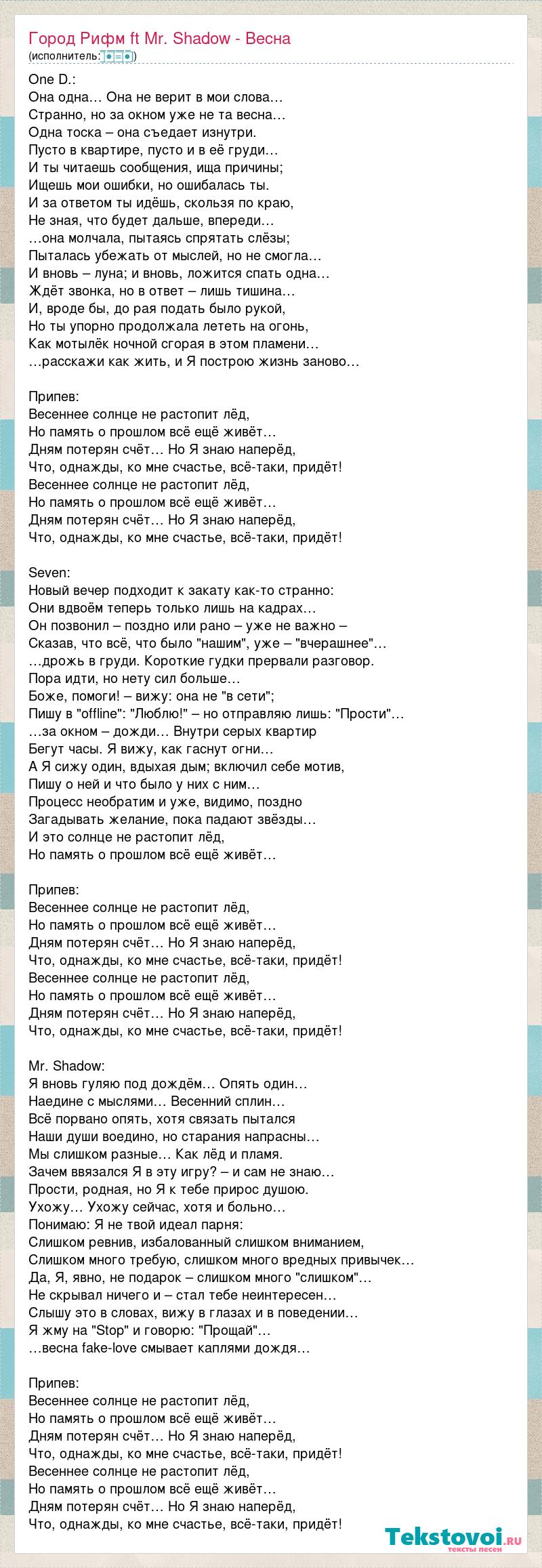 One D.: Она одна… Она не верит в мои слова… Странно, но за окном уже не та весна… Одна тоска – она съедает изнутри. Пусто в квартире, пусто и в её груди… И ты читаешь сообщения, ища причины; Ищешь мои ошибки, но ошибалась ты. И за ответом ты идёшь, скользя по краю, Не зная, что будет дальше, впереди… …она молчала, пытаясь спрятать слёзы; Пыталась убежать от мыслей, но не смогла… И вновь – луна; и вновь, ложится спать одна… Ждёт звонка, но в ответ – лишь тишина… И, вроде бы, до рая подать было рукой, Но ты упорно продолжала лететь на огонь, Как мотылёк ночной сгорая в этом пламени… …расскажи как жить, и Я построю жизнь заново… Припев: Весеннее солнце не растопит лёд, Но память о прошлом всё ещё живёт… Дням потерян счёт… Но Я знаю наперёд, Что, однажды, ко мне счастье, всё-таки, придёт! Весеннее солнце не растопит лёд, Но память о прошлом всё ещё живёт… Дням потерян счёт… Но Я знаю наперёд, Что, однажды, ко мне счастье, всё-таки, придёт! Seven: Новый вечер подходит к закату как-то странно: Они вдвоём теперь только лишь на кадрах… Он позвонил – поздно или рано – уже не важно – Сказав, что всё, что было "нашим", уже – "вчерашнее"… …дрожь в груди. Короткие гудки прервали разговор. Пора идти, но нету сил больше… Боже, помоги! – вижу: она не "в сети"; Пишу в "offline": "Люблю!" – но отправляю лишь: "Прости"… …за окном – дожди… Внутри серых квартир Бегут часы. Я вижу, как гаснут огни… А Я сижу один, вдыхая дым; включил себе мотив, Пишу о ней и что было у них с ним… Процесс необратим и уже, видимо, поздно Загадывать желание, пока падают звёзды… И это солнце не растопит лёд, Но память о прошлом всё ещё живёт… Припев: Весеннее солнце не растопит лёд, Но память о прошлом всё ещё живёт… Дням потерян счёт… Но Я знаю наперёд, Что, однажды, ко мне счастье, всё-таки, придёт! Весеннее солнце не растопит лёд, Но память о прошлом всё ещё живёт… Дням потерян счёт… Но Я знаю наперёд, Что, однажды, ко мне счастье, всё-таки, придёт! Mr. Shadow: Я вновь гуляю под дождём… Опять один… Наедине с мыслями… Весенний сплин… Всё порвано опять, хотя связать пытался Наши души воедино, но старания напрасны… Мы слишком разные… Как лёд и пламя. Зачем ввязался Я в эту игру? – и сам не знаю… Прости, родная, но Я к тебе прирос душою. Ухожу… Ухожу сейчас, хотя и больно… Понимаю: Я не твой идеал парня: Слишком ревнив, избалованный слишком вниманием, Слишком много требую, слишком много вредных привычек… Да, Я, явно, не подарок – слишком много "слишком"… Не скрывал ничего и – стал тебе неинтересен… Слышу это в словах, вижу в глазах и в поведении… Я жму на "Stop" и говорю: "Прощай"… …весна fake-love смывает каплями дождя… Припев: Весеннее солнце не растопит лёд, Но память о прошлом всё ещё живёт… Дням потерян счёт… Но Я знаю наперёд, Что, однажды, ко мне счастье, всё-таки, придёт! Весеннее солнце не растопит лёд, Но память о прошлом всё ещё живёт… Дням потерян счёт… Но Я знаю наперёд, Что, однажды, ко мне счастье, всё-таки, придёт!
