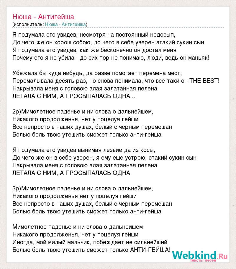 Я подумала его увидев, несмотря на постоянный недосып, До чего же он хорош собою, до чего в себе уверен этакий сукин сын Я подумала его увидев, как же бесконечно он достал меня Почему его я не убила - до сих пор не понимаю, люди, ведь он маньяк! Убежала бы куда нибудь, да разве помогает перемена мест, Перемалывала десять раз, но снова понимала, что все-таки он THE BEST! Накрывала меня с головою алая залатанная пелена ЛЕТАЛА С НИМ, А ПРОСЫПАЛАСЬ ОДНА... 2р)Мимолетное паденье и ни слова о дальнейшем, Никакого продолженья, нет у поцелуя гейши Все непросто в наших душах, белый с черным перемешан Болью боль твою утешить сможет только анти-гейша Я подумала его увидев вынимая лезвие да из косы, До чего же он в себе уверен, я ему еще устрою, этакий сукин сын Накрывала меня с головою алая залатанная пелена ЛЕТАЛА С НИМ, А ПРОСЫПАЛАСЬ ОДНА 3р)Мимолетное паденье и ни слова о дальнейшем, Никакого продолженья нет у поцелуя гейши Все непросто в наших душах, белый с черным перемешан Болью боль твою утешить сможет только анти-гейша Мимолетное паденье и ни слова о дальнейшем Никакого продолженья, нет у поцелуя гейши Иногда, мой милый мальчик, побеждает не сильнейший Болью боль твою утешить сможет только АНТИ-ГЕЙША!