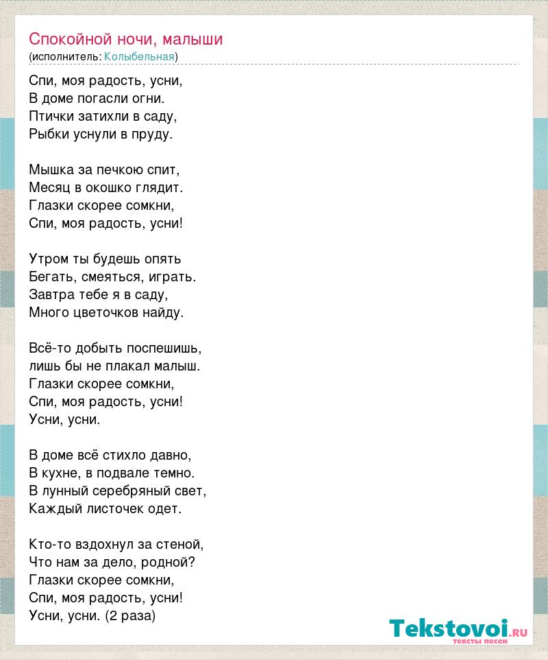 Спи, моя радость, усни, В доме погасли огни. Птички затихли в саду, Рыбки уснули в пруду. Мышка за печкою спит, Месяц в окошко глядит. Глазки скорее сомкни, Спи, моя радость, усни! Утром ты будешь опять Бегать, смеяться, играть. Завтра тебе я в саду, Много цветочков найду. Всё-то добыть поспешишь, лишь бы не плакал малыш. Глазки скорее сомкни, Спи, моя радость, усни! Усни, усни. В доме всё стихло давно, В кухне, в подвале темно. В лунный серебряный свет, Каждый листочек одет. Кто-то вздохнул за стеной, Что нам за дело, родной? Глазки скорее сомкни, Спи, моя радость, усни! Усни, усни. (2 раза)