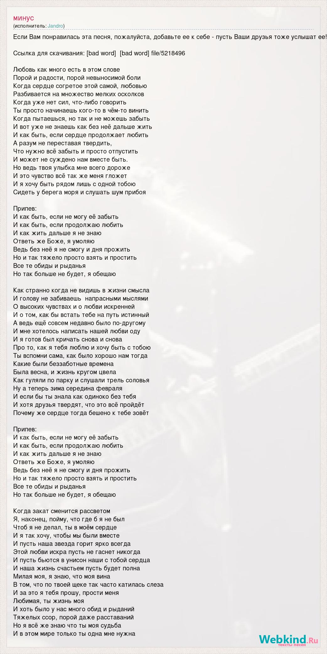 Если Вам понравилась эта песня, пожалуйста, добавьте ее к себе - пусть Ваши друзья тоже услышат ее! Ссылка для скачивания: [bad word] [bad word] file/5218496 Любовь как много есть в этом слове Порой и радости, порой невыносимой боли Когда сердце согретое этой самой, любовью Разбивается на множество мелких осколков Когда уже нет сил, что-либо говорить Ты просто начинаешь кого-то в чём-то винить Когда пытаешься, но так и не можешь забыть И вот уже не знаешь как без неё дальше жить И как быть, если сердце продолжает любить А разум не переставая твердить, Что нужно всё забыть и просто отпустить И может не суждено нам вместе быть. Но ведь твоя улыбка мне всего дороже И это чувство всё так же меня гложет И я хочу быть рядом лишь с одной тобою Сидеть у берега моря и слушать шум прибоя Припев: И как быть, если не могу её забыть И как быть, если продолжаю любить И как жить дальше я не знаю Ответь же Боже, я умоляю Ведь без неё я не смогу и дня прожить Но и так тяжело просто взять и простить Все те обиды и рыданья Но так больше не будет, я обещаю Как странно когда не видишь в жизни смысла И голову не забиваешь напрасными мыслями О высоких чувствах и о любви искренней И о том, как бы встать тебе на путь истинный А ведь ещё совсем недавно было по-другому И мне хотелось написать нашей любви оду И я готов был кричать снова и снова Про то, как я тебя люблю и хочу быть с тобою Ты вспомни сама, как было хорошо нам тогда Какие были беззаботные времена Была весна, и жизнь кругом цвела Как гуляли по парку и слушали трель соловья Ну а теперь зима середина февраля И если бы ты знала как одиноко без тебя И хотя друзья твердят, что это всё пройдёт Почему же сердце тогда бешено к тебе зовёт Припев: И как быть, если не могу её забыть И как быть, если продолжаю любить И как жить дальше я не знаю Ответь же Боже, я умоляю Ведь без неё я не смогу и дня прожить Но и так тяжело просто взять и простить Все те обиды и рыданья Но так больше не будет, я обещаю Когда закат сменится рассветом Я, наконец, пойму, что где б я не был Чтоб я не делал, ты в моём сердце И я так хочу, чтобы мы были вместе И пусть наша звезда горит ярко всегда Этой любви искра пусть не гаснет никогда И пусть бьются в унисон наши с тобой сердца И наша жизнь счастьем пусть будет полна Милая моя, я знаю, что моя вина В том, что по твоей щеке так часто катилась слеза И за это я тебя прошу, прости меня Любимая, ты жизнь моя И хоть было у нас много обид и рыданий Тяжелых ссор, порой даже расставаний Но я всё же знаю что ты моя судьба И в этом мире только ты одна мне нужна