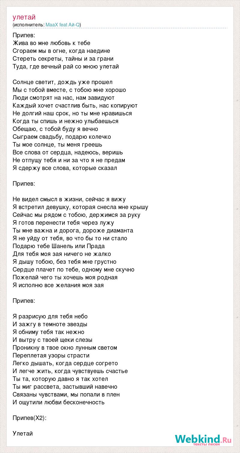 Припев: Жива во мне любовь к тебе Сгораем мы в огне, когда наедине Стереть секреты, тайны и за грани Туда, где вечный рай со мною улетай Солнце светит, дождь уже прошел Мы с тобой вместе, с тобою мне хорошо Люди смотрят на нас, нам завидуют Каждый хочет счастлив быть, нас копируют Не долгий наш срок, но ты мне нравишься Когда ты спишь и нежно улыбаешься Обещаю, с тобой буду я вечно Сыграем свадьбу, подарю колечко Ты мое солнце, ты меня греешь Все слова от сердца, надеюсь, веришь Не отпущу тебя и ни за что я не предам Я сдержу все слова, которые сказал Припев: Не видел смысл в жизни, сейчас я вижу Я встретил девушку, которая снесла мне крышу Сейчас мы рядом с тобою, держимся за руку Я готов перенести тебя через лужу Ты мне важна и дорога, дороже диаманта Я не уйду от тебя, во что бы то ни стало Подарю тебе Шанель или Прада Для тебя моя зая ничего не жалко Я дышу тобою, без тебя мне грустно Сердце плачет по тебе, одному мне скучно Пожелай чего ты хочешь моя родная Я исполню все желания моя зая Припев: Я разрисую для тебя небо И зажгу в темноте звезды Я обниму тебя так нежно И вытру с твоей щеки слезы Проникну в твое окно лунным светом Переплетая узоры страсти Легко дышать, когда сердце согрето И легче жить, когда чувствуешь счастье Ты та, которую давно я так хотел Ты миг рассвета, застывший навечно Связаны чувствами, мы попали в плен И ощутили любви бесконечность Припев(Х2): Улетай