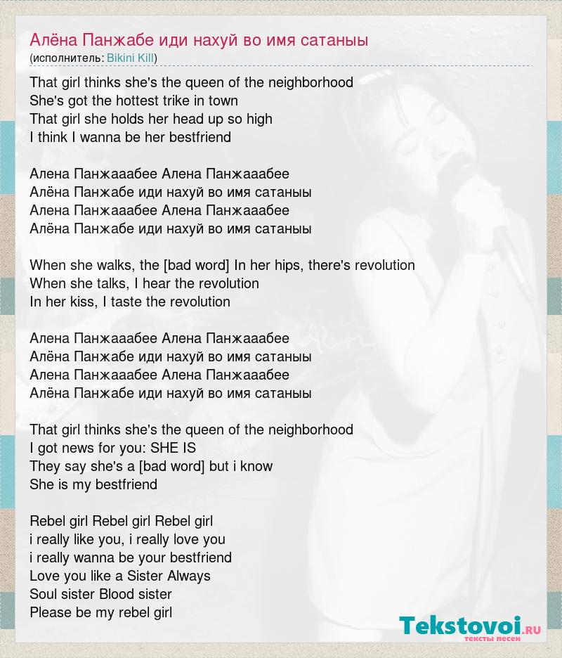 That girl thinks she's the queen of the neighborhood She's got the hottest trike in town That girl she holds her head up so high I think I wanna be her bestfriend Алена Панжааабее Алена Панжааабее Алёна Панжабе иди нахуй во имя сатаныы Алена Панжааабее Алена Панжааабее Алёна Панжабе иди нахуй во имя сатаныы When she walks, the revolution's coming In her hips, there's revolution When she talks, I hear the revolution In her kiss, I taste the revolution Алена Панжааабее Алена Панжааабее Алёна Панжабе иди нахуй во имя сатаныы Алена Панжааабее Алена Панжааабее Алёна Панжабе иди нахуй во имя сатаныы That girl thinks she's the queen of the neighborhood I got news for you: SHE IS They say she's a [bad word] but i know She is my bestfriend Rebel girl Rebel girl Rebel girl i really like you, i really love you i really wanna be your bestfriend Love you like a Sister Always Soul sister Blood sister Please be my rebel girl