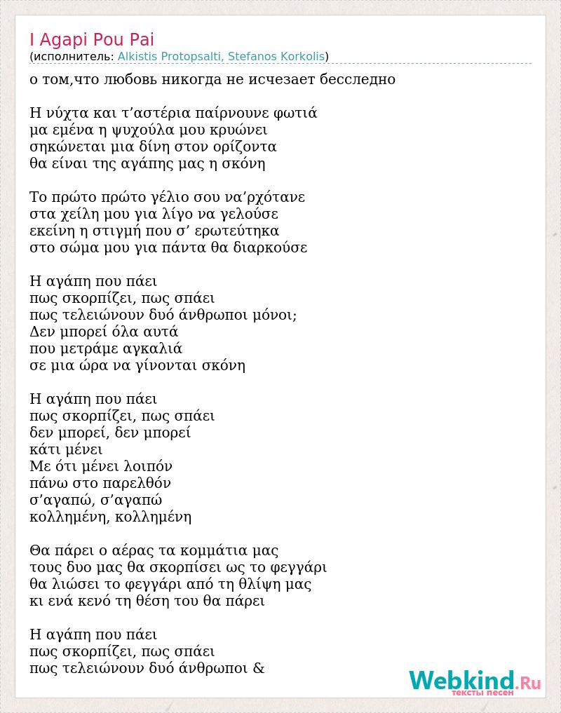 о том,что любовь никогда не исчезает бесследно Η νύχτα και τ’αστέρια παίρνουνε φωτιά μα εμένα η ψυχούλα μου κρυώνει σηκώνεται μια δίνη στον ορίζοντα θα είναι της αγάπης μας η σκόνη Το πρώτο πρώτο γέλιο σου να’ρχότανε στα χείλη μου για λίγο να γελούσε εκείνη η στιγμή που σ’ ερωτεύτηκα στο σώμα μου για πάντα θα διαρκούσε Η αγάπη που πάει πως σκορπίζει, πως σπάει πως τελειώνουν δυό άνθρωποι μόνοι; Δεν μπορεί όλα αυτά που μετράμε αγκαλιά σε μια ώρα να γίνονται σκόνη Η αγάπη που πάει πως σκορπίζει, πως σπάει δεν μπορεί, δεν μπορεί κάτι μένει Με ότι μένει λοιπόν πάνω στο παρελθόν σ’αγαπώ, σ’αγαπώ κολλημένη, κολλημένη Θα πάρει ο αέρας τα κομμάτια μας τους δυο μας θα σκορπίσει ως το φεγγάρι θα λιώσει το φεγγάρι από τη θλίψη μας κι ενά κενό τη θέση του θα πάρει Η αγάπη που πάει πως σκορπίζει, πως σπάει πως τελειώνουν δυό άνθρωποι &