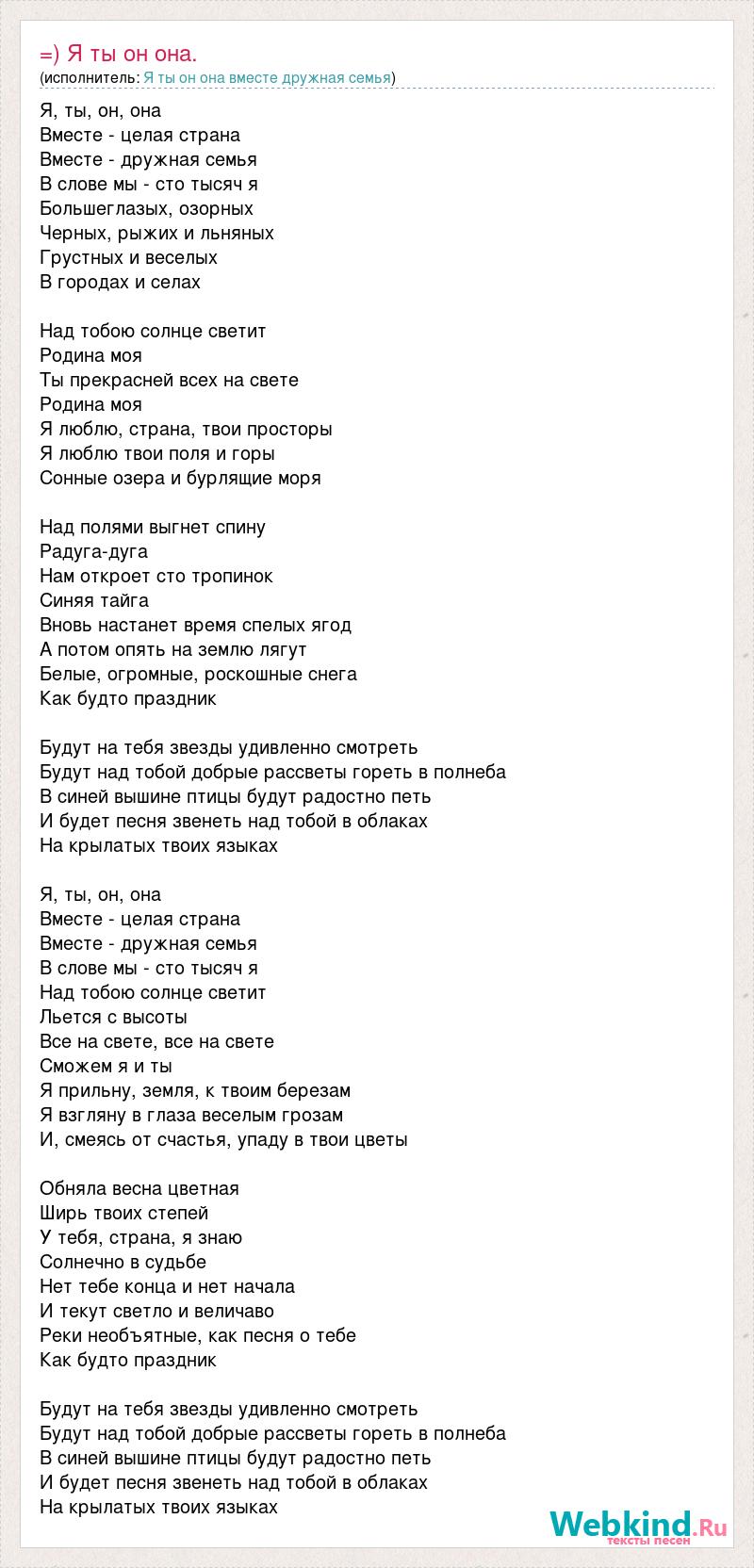 Я, ты, он, она Вместе - целая страна Вместе - дружная семья В слове мы - сто тысяч я Большеглазых, озорных Черных, рыжих и льняных Грустных и веселых В городах и селах Над тобою солнце светит Родина моя Ты прекрасней всех на свете Родина моя Я люблю, страна, твои просторы Я люблю твои поля и горы Сонные озера и бурлящие моря Над полями выгнет спину Радуга-дуга Нам откроет сто тропинок Синяя тайга Вновь настанет время спелых ягод А потом опять на землю лягут Белые, огромные, роскошные снега Как будто праздник Будут на тебя звезды удивленно смотреть Будут над тобой добрые рассветы гореть в полнеба В синей вышине птицы будут радостно петь И будет песня звенеть над тобой в облаках На крылатых твоих языках Я, ты, он, она Вместе - целая страна Вместе - дружная семья В слове мы - сто тысяч я Над тобою солнце светит Льется с высоты Все на свете, все на свете Сможем я и ты Я прильну, земля, к твоим березам Я взгляну в глаза веселым грозам И, смеясь от счастья, упаду в твои цветы Обняла весна цветная Ширь твоих степей У тебя, страна, я знаю Солнечно в судьбе Нет тебе конца и нет начала И текут светло и величаво Реки необъятные, как песня о тебе Как будто праздник Будут на тебя звезды удивленно смотреть Будут над тобой добрые рассветы гореть в полнеба В синей вышине птицы будут радостно петь И будет песня звенеть над тобой в облаках На крылатых твоих языках